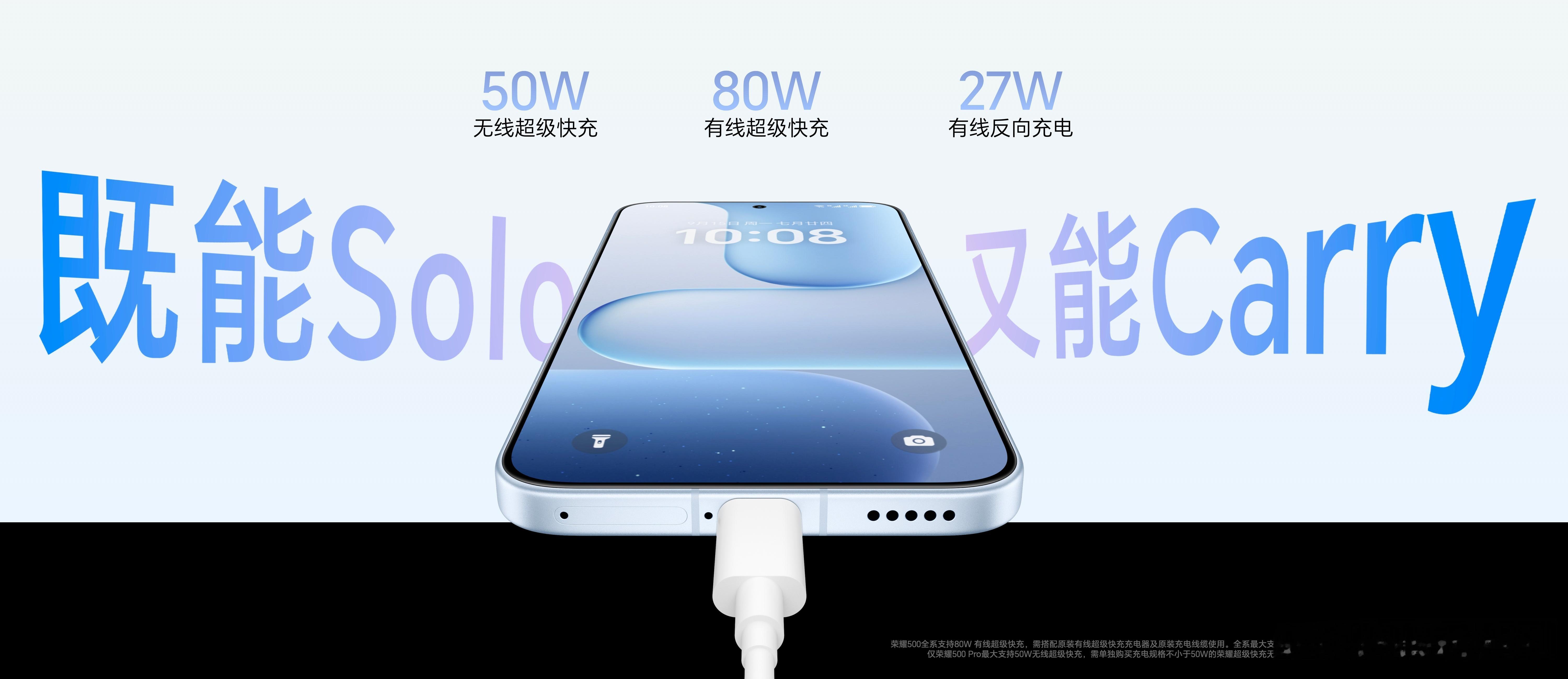 系列超大电池,超久续航!荣耀500全系搭载8000mAh青海湖大电池,并搭载旗舰同款HONOR E2能效增强芯片及都江堰AI电源管理系统,深度优化电池使用场景,实现续航“0”焦虑。荣耀500系列搭载80W有线超级快充,Pro搭载50W无线超级快充,并全系支持行业最强的27W有线反向充电,你的苹果好搭子,carry全场。