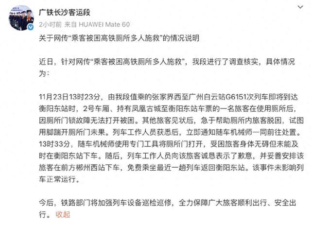 11月24日,@广铁长沙客运段发布关于网传“乘客被困高铁厕所多人施救”的情况说明。内容如下:
