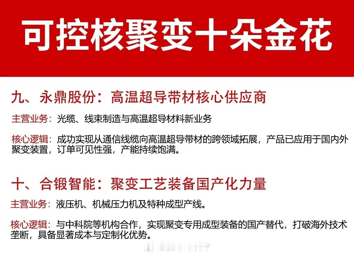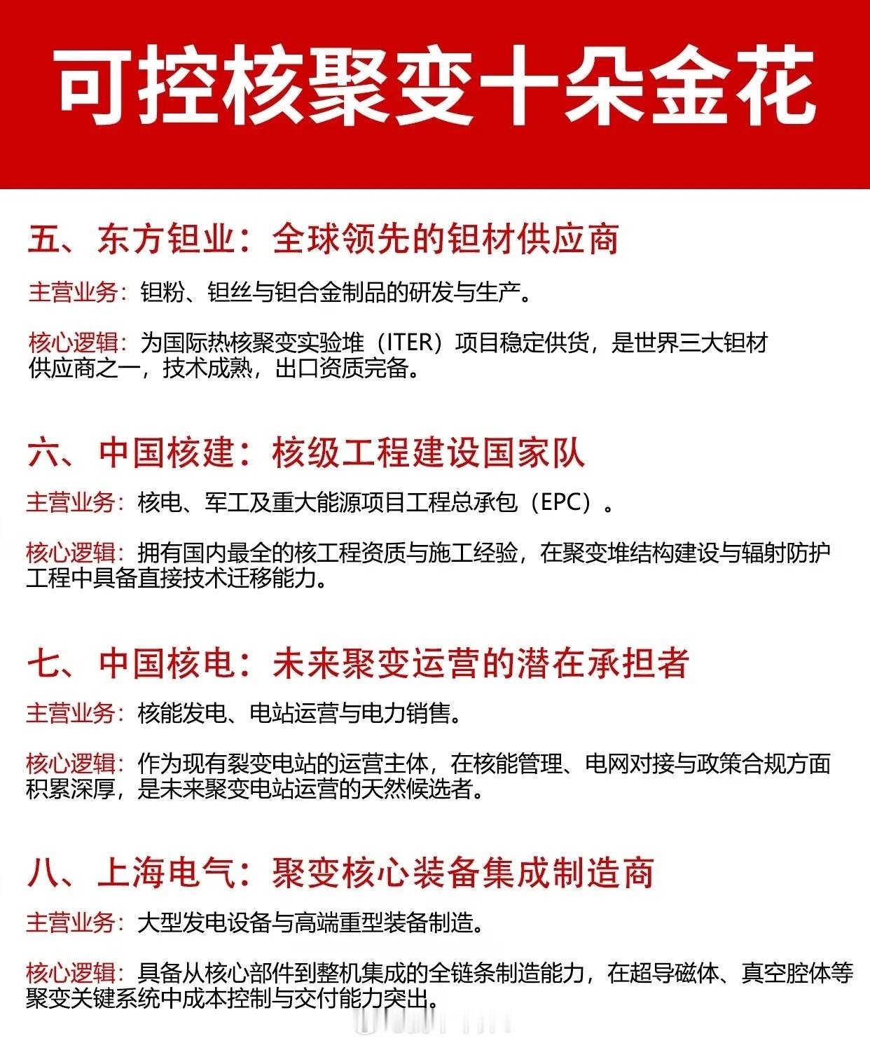以下围绕“可控核聚变十朵金花”展开,介绍了十家在可控核聚变领域具有代表性的中国企业及其核心优势与战略价值:1. 皖能电力:作为安徽省主要电力与热力供应企业,其稳健的火电业务带来稳定现金流,为布局核聚变等前沿科技提供了坚实的财务基础和风险抵御能力,体现“以传统养新兴”的发展路径。2. 安泰科技:专注于高端金属材料、超薄带材及特种合金研发制造,尤其在面向等离子体材料领域拥有核心技术,是托卡马克装置的关键材料供应商,技术壁垒高,属于产业链中的“卡脖子”环节。3. 厦门钨业:构建了从钨矿采选到硬质合金及精密刀具的完整产业链,通过上下游一体化实现成本优化与供应稳定,在聚变装置高温部件与屏蔽材料方面具备良好应用前景。4. 国泰集团:主营民用爆破器材与特种金属材料,其子公司是国内少数几家能够生产聚变用冷门小金属靶材的企业,产品稀缺性强,具备较强的市场议价能力。5. 东方钽业:是全球领先的钽材供应商之一,为国际热核聚变实验堆(ITER)稳定供货,拥有成熟的钽粉、钽丝及钽合金产品技术和完善的出口资质,技术实力与市场地位兼备。6. 中国核建:作为国家核级工程建设的“国家队”,具备核电、军工及重大能源项目的EPC总包能力,拥有国内最全面的核工程资质和丰富的施工经验,其技术可快速迁移到聚变堆结构与辐射防护工程中。7. 中国核电:目前主要从事核能发电与电站运营,作为国内裂变电站的主要运营方,在核能管理、电网接入及政策合规等方面经验丰富,是未来聚变电站运营的天然候选者。8. 上海电气:在大型发电设备和高端重型装备制造领域实力雄厚,具备聚变关键系统如超导磁体、真空腔体等从核心部件到整机的集成制造能力,在成本控制与交付效率方面表现突出。9. 永鼎股份:传统业务涵盖光缆与线束制造,近年来成功拓展至高温超导材料领域,其高温超导带材产品已应用于多个国内外聚变装置,订单充足、产能饱满,显示出良好的市场应用潜力。10. 合锻智能:主营液压机、机械压力机及特种成型产线,通过与包括中科院在内的科研机构合作,实现了聚变专用成型装备的国产替代,打破了海外技术垄断,具备成本优势和高度定制化能力。总体来看,这十家企业分别从电力保障、关键材料、工程建设、装备制造、超导技术等多个维度,构成了中国可控核聚变产业链的重要支撑,代表了中国在该前沿科技领域的多元化布局与核心竞争力。