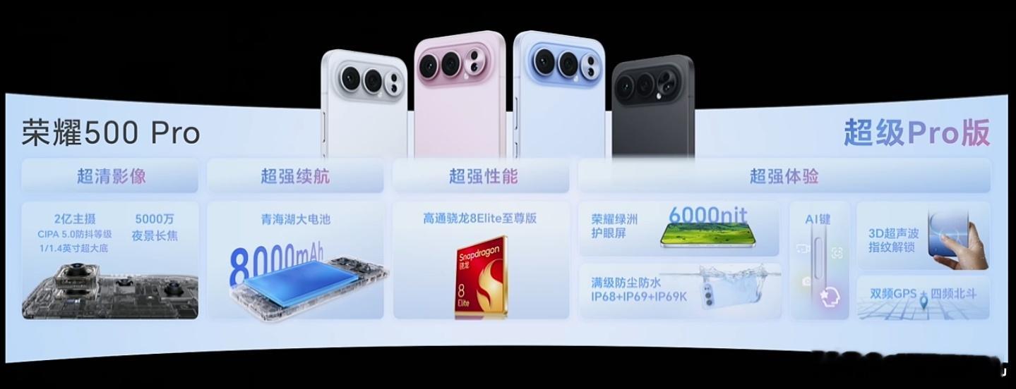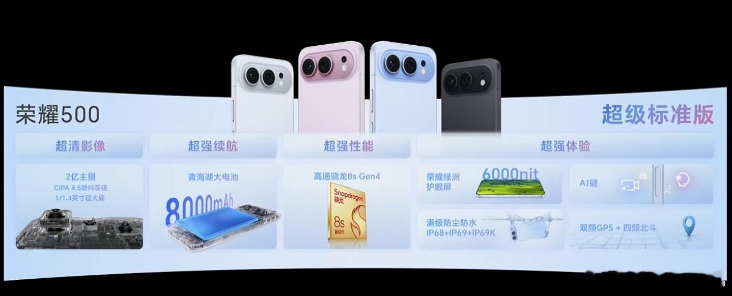 荣耀500系列以双超实力成年度神机,影像上,2亿像素主摄与全能实况模式,提升抓拍、夜景等场景表现,性能搭载双8旗舰,搭配强散热,轻松应对高负载,续航更有8000mAh超大青海湖电池,全系搭载荣耀绿洲护眼屏且显示效果极佳。2699元起售价远低于同档竞品,甚至可以说是降维打击,在成本上涨时坚持友好定价与越级配置,领跑同档,是兼具体验与性价比的优选。