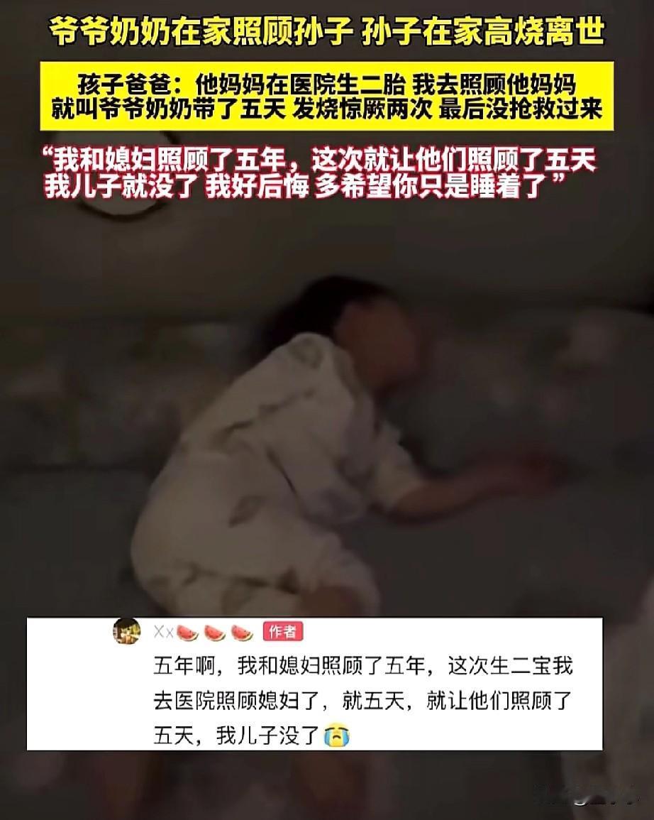 明天和意外不知道哪个先来!近日河南,发生了一件悲剧。妈妈生二胎就把五岁的孩子放在爷爷奶奶那边,孩子发烧吃完不管用,送到医院后惊厥了两次,抢救了三个小时还是没能抢救过来。 原来,夫妻俩之前生了一个孩子,孩子都是自己带到了5岁,哪料二胎要生了,孩子又没人照顾,带到医院又怕也顾不上,就把孩子送到了爷爷奶奶家里。 可能是因为换了一个环境,孩子不适应开始发烧,但吃药了却不管用,立马送到了医院,在医院里面孩子就惊厥了两次,医生也进行了抢救。 可是遗憾的是,抢救了三个小时还是没能抢救回来。 这个5岁可爱的孩子,被送到爷爷奶奶家里的第五天就没了。 孩子的爸爸也不想去相信自己的孩子就这样没了,他多么希望孩子是睡着了,可是现实很残酷,孩子是真的没了。 如今,孩子爸爸特别的内疚,如果当初在家里照顾他,或者是带他去医院里面,也许就不会发生这样的事情了。 也不知道当孩子的妈妈知道事情后,那得多心痛啊,那是自己小心翼翼养了5年的孩子啊。 恐怕这一辈子 ,孩子的爸爸心里有结了,过不去的坎。 说实话,现在的感冒,已经不是十几年前,冻到的感冒一样了,现在病毒感冒很厉害的,哪里不舒服,还是赶紧带去医院,千万不要在家里拖了。