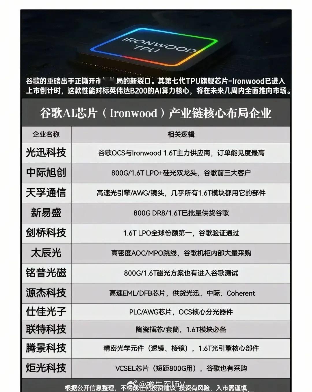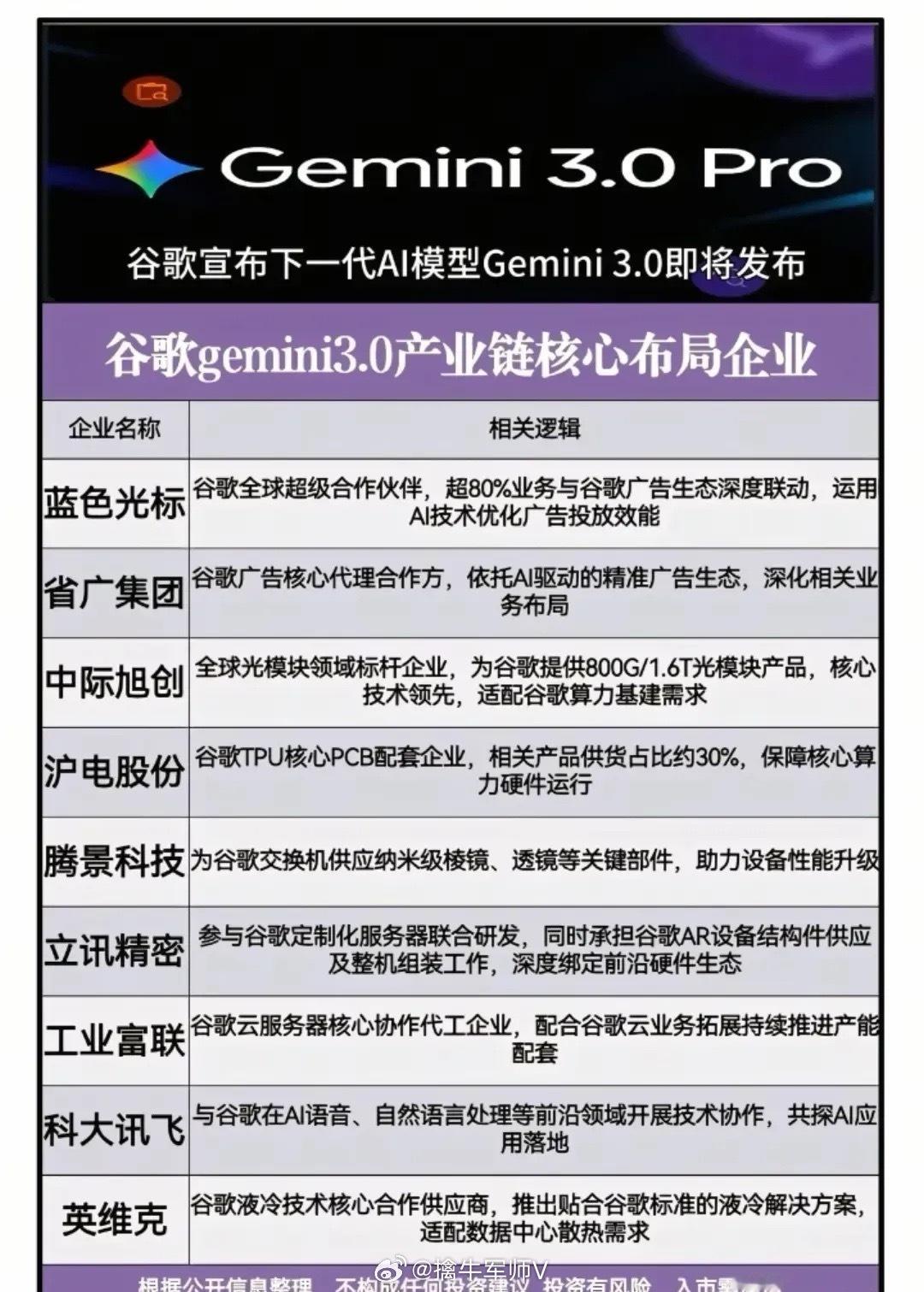 谷歌AI大模型概念龙头梳理!谷歌美股股价一度上涨5.8%,美股人气榜排名第三!近日谷歌发布新款大模型Gemini 3,该模型在性能上全面刷新多项行业纪录,同步推出配套开发平台并快速落地全生态,还引发行业和市场的强烈反响。中国上市公司与谷歌关联度较高的公司有哪些?蓝色光标:公司连续多年跻身全球传播集团前十,是谷歌全球超级合作伙伴,超80%业务联动广告生态。省广集团:中国广告行业的领先企业之一,是谷歌广告核心代理。光迅科技:光模块、光器件行业龙头,是谷歌OCS主要供应商。万兴科技:集成Gemini模型优化图像生成。理财有风险投资需谨慎,资料取材网络仅供参考。