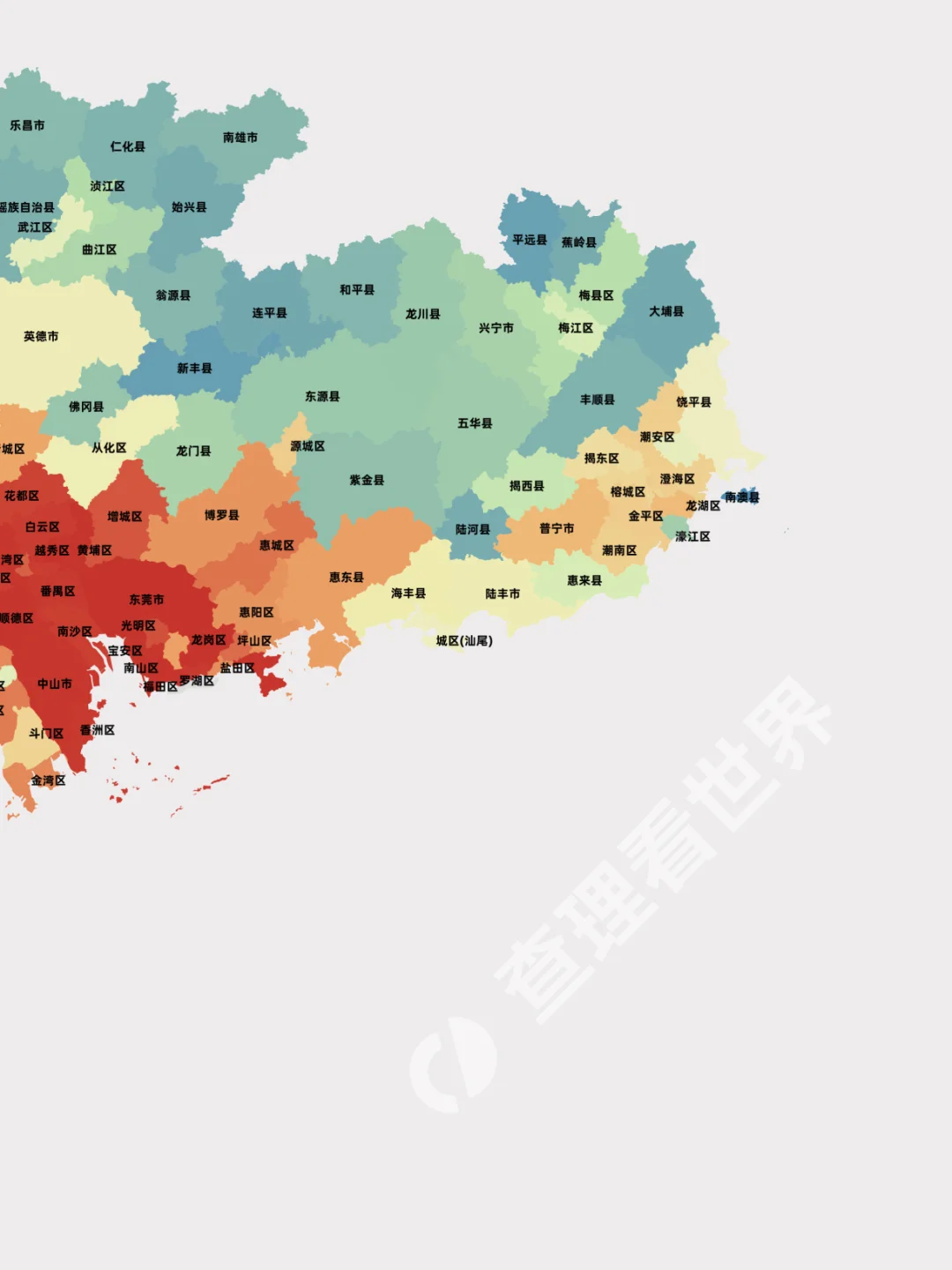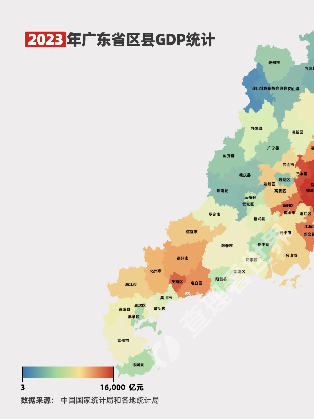 广东省GDP 排名前五的区县及其数值分别为: 南山区,GDP 为 8566.02 亿元; 天河区,GDP 为 6551.26 亿元; 福田区,GDP 为 5704.55 亿元; 宝安区,GDP 为 5202.01 亿元; 龙岗区,GDP 为 5043.03 亿元。 ★原创地图内容谢绝转载★ 广东 大湾区 地图 经济 地理 数据可视化 广州 深圳
