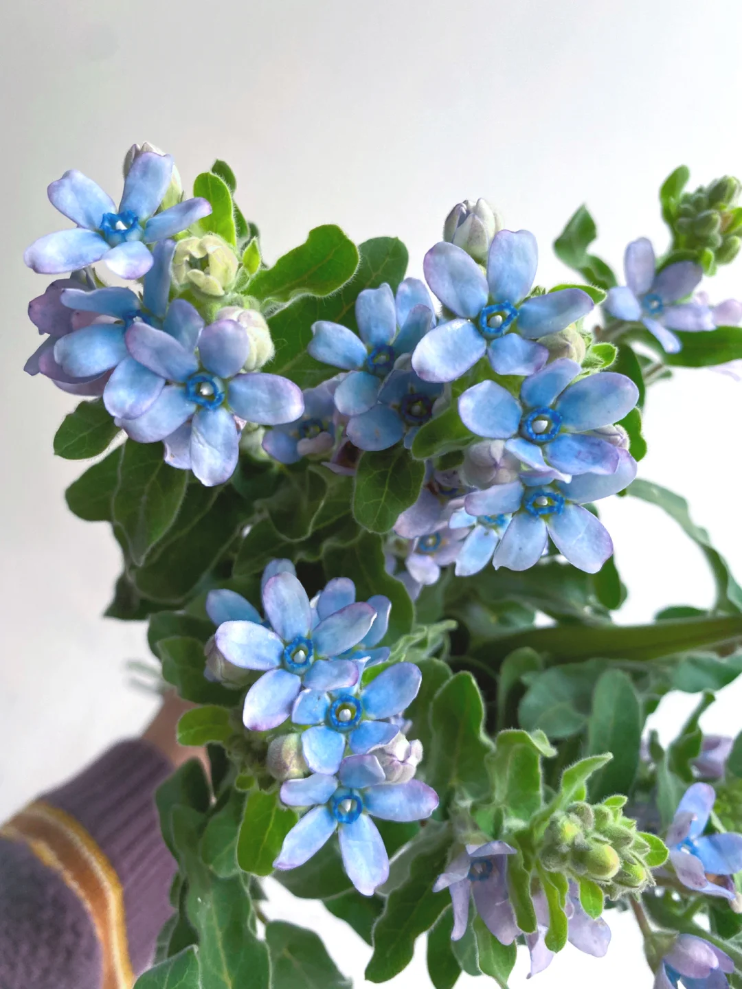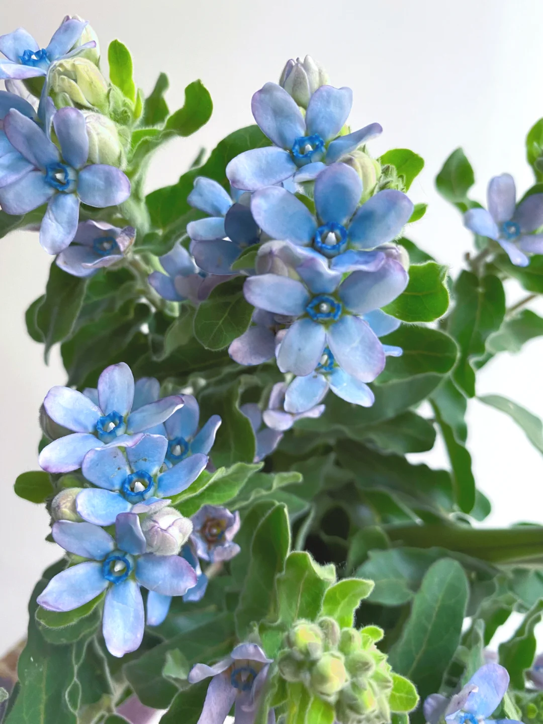 蓝星花是一种小巧精致的花,且呈自然界中比较少见的蓝色。它切开以后都会有白色的汁液流出,有的人会过敏,需要小心使用,处理的时候最好戴手套。很多花材会有白色的汁液,基本上都是需要注意的,但是不必太过担心。