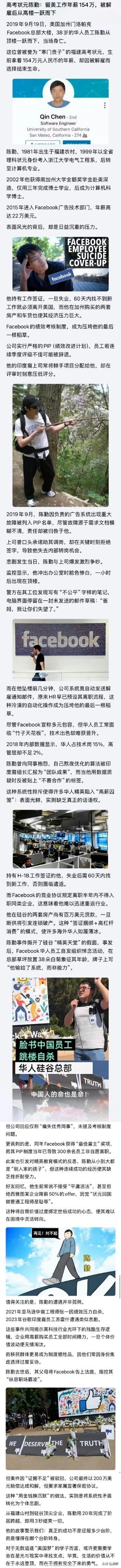 福建高考状元在Facebook遭印度主管打压后跳楼… 1981年生于福建农村的陈勤,1999年以全省理科状元考入浙大,后转计算机专业;2002年拿全奖赴美读博,2015年进入Facebook,成为年薪22万美元的工程师。 在Facebook,压在他身上最重是印度裔上司的刻意打压,公司严苛的PIP绩效制度成了上司的“武器”,印度裔上司每次评审都会刻意压低他的分数。2019年9月,广告系统因需求文档模糊出了故障,责任却全推给陈勤,他被列入PIP名单。 9月19日,他和上司爆发了最后一次激烈争吵,冲出办公室。一小时后,38岁的他从Facebook总部顶楼跃下,工位上留着写有“不公平”的笔记,电脑里是未发送的那句“爸妈,我让你们失望了”。 而在他坠楼前几分钟,公司系统自动发出解雇邮件——HR早已提前预设好他的离职流程,连最后一点体面都没给他留下。