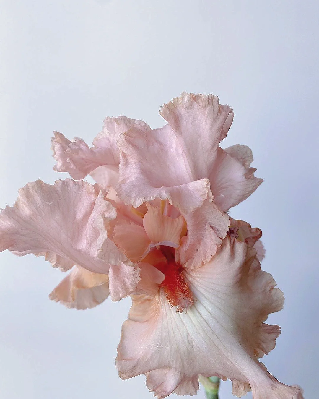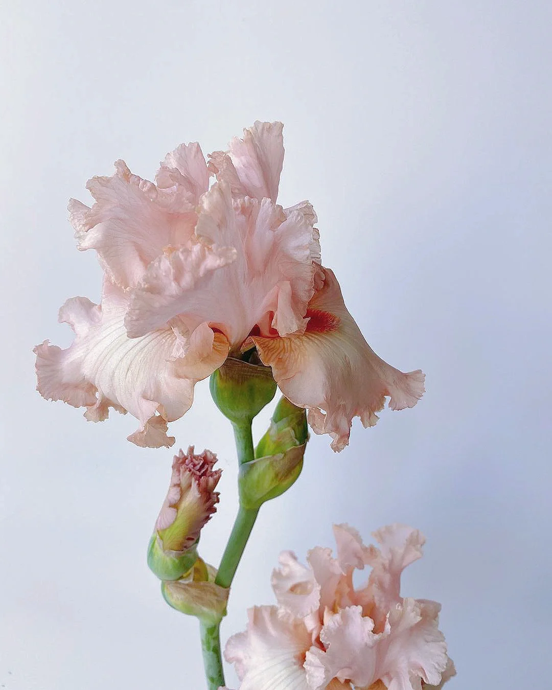 德国鸢尾是非常受花艺爱好者欢迎的花材,造型优雅缱绻,花瓣轻薄且多波浪,集优雅与柔美与一身。但美好的事物总是短暂的,在鲜切花中极少看到德国鸢尾的身影,因为它的花期较香根鸢尾来说更短,香根鸢尾的花期较长,但每支花只有一个花头,德国鸢尾却有多个花苞,可依次开花,种类和颜色都非常丰富,大自然真的是优秀的配色大师,每一款都超好看。