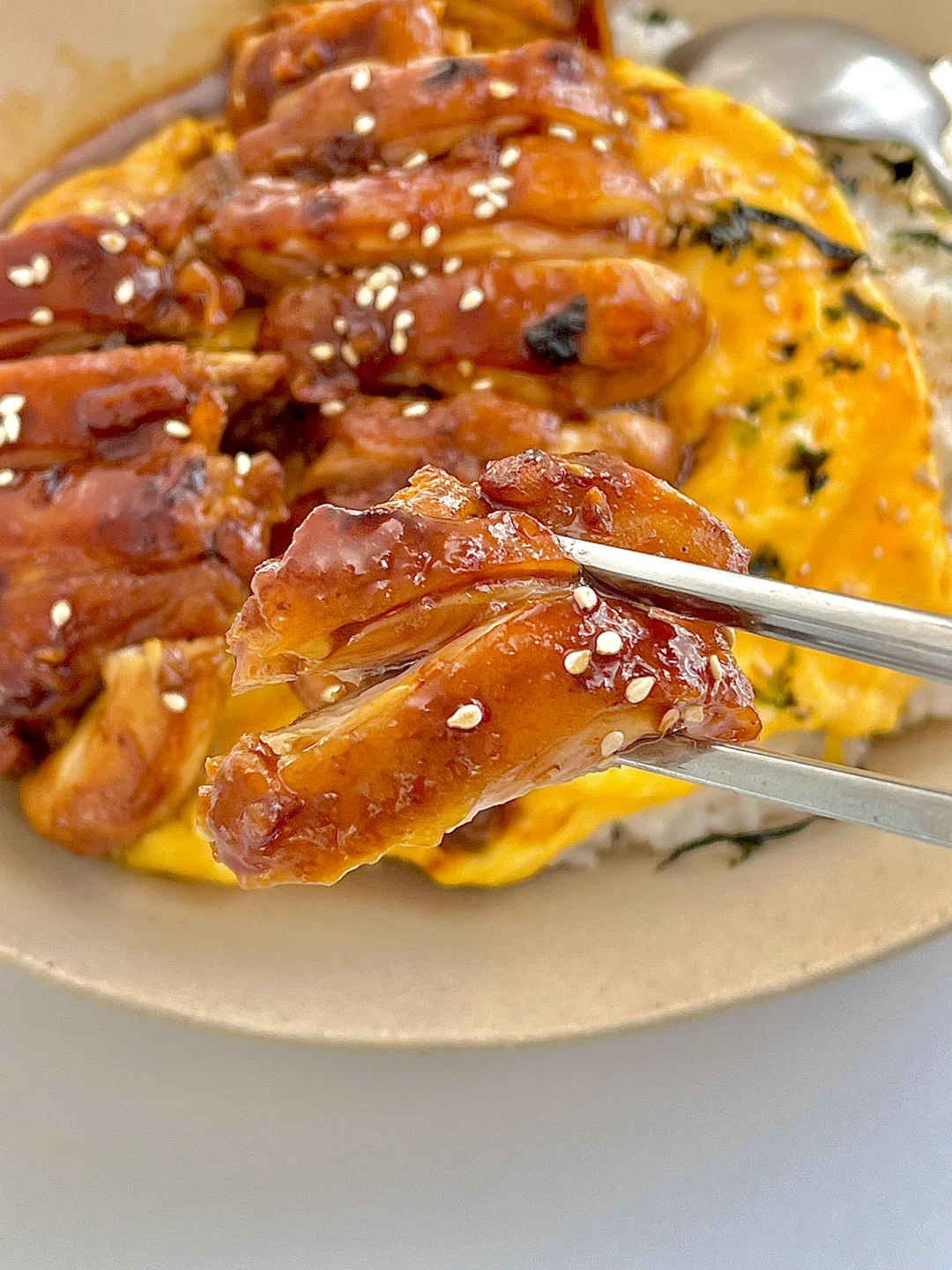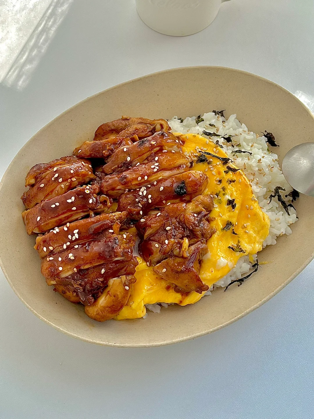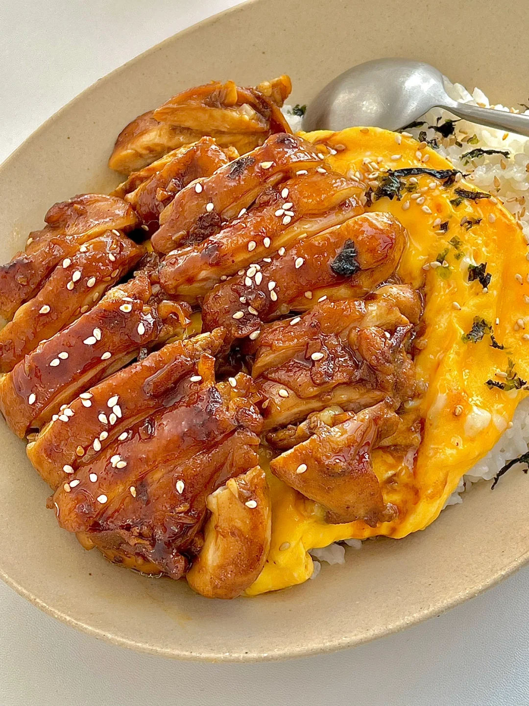 一碗色香味俱全的盖饭做好了,真的真的巨好吃,嫩嫩的滑蛋搭配裹满酱汁的鸡腿肉,这一口下去谁不迷糊😋