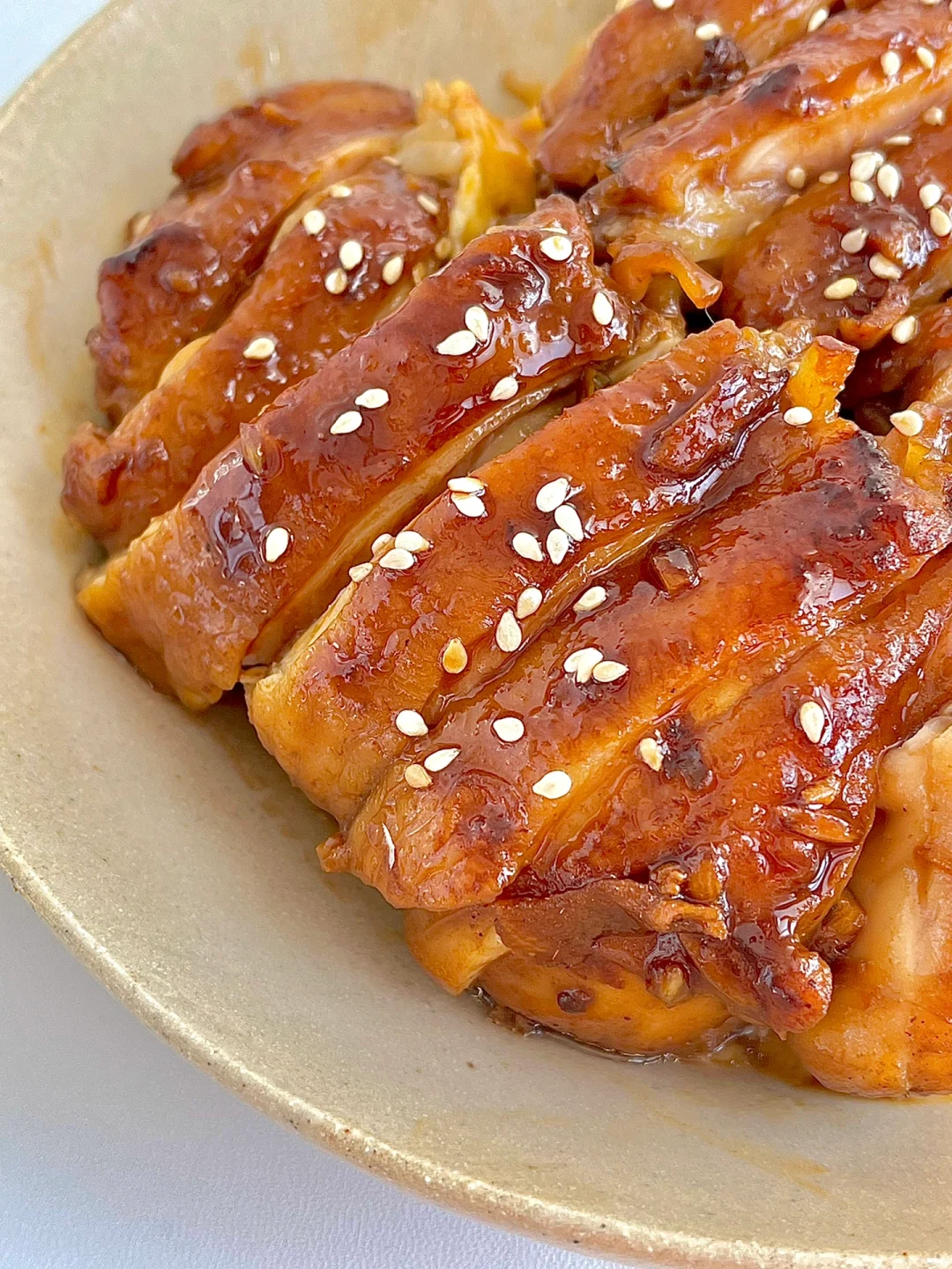 7️⃣碗中放上米饭,依次把滑蛋和照烧鸡腿放在上面,在淋上锅中剩下的料汁,撒点海苔碎即可。