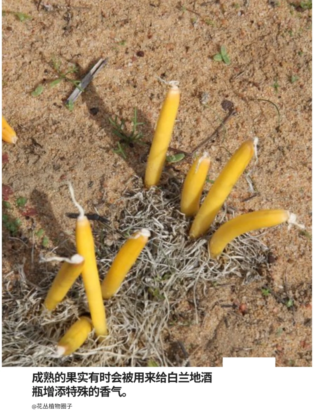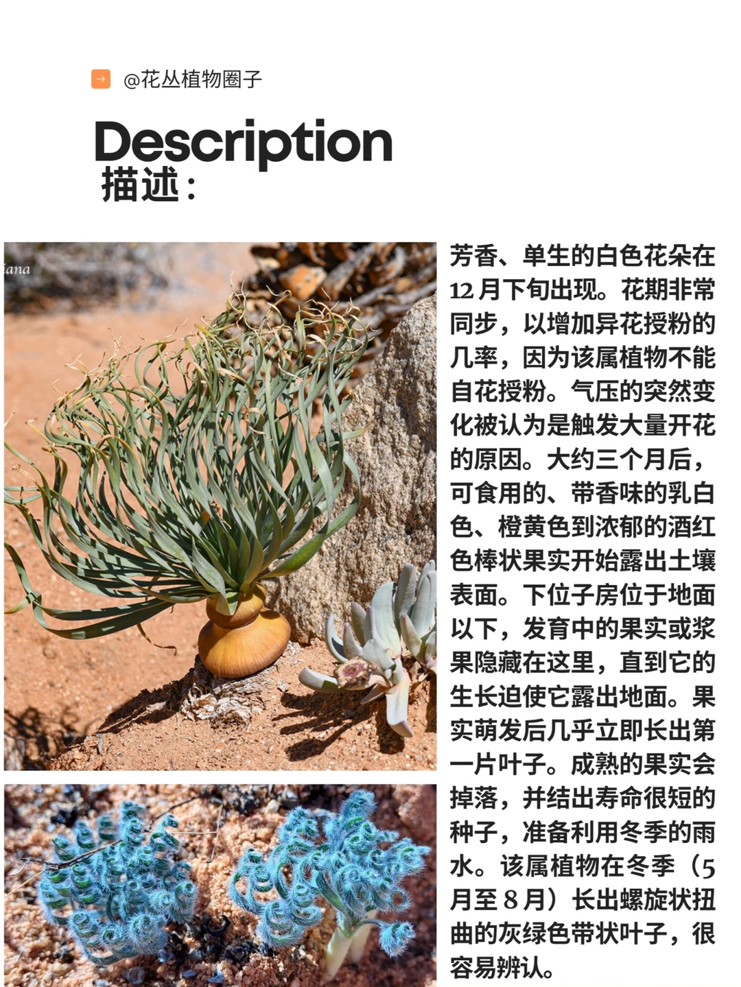 芳香、单生的白色花朵在 12 月下旬出现。花期非常同步,以增加异花授粉的几率,因为该属植物不能自花授粉。气压的突然变化被认为是触发大量开花的原因。大约三个月后,可食用的、带香味的乳白色、橙黄色到浓郁的酒红色棒状果实开始露出土壤表面。下位子房位于地面以下,发育中的果实或浆果隐藏在这里,直到它的生长迫使它露出地面。果实萌发后几乎立即长出第一片叶子。成熟的果实会掉落,并结出寿命很短的种子,准备利用冬季的雨水。该属植物在冬季(5 月至 8 月)长出螺旋状扭曲的灰绿色带状叶子,很容易辨认。成熟的果实有时会被用来给白兰地酒增添特殊的香气。