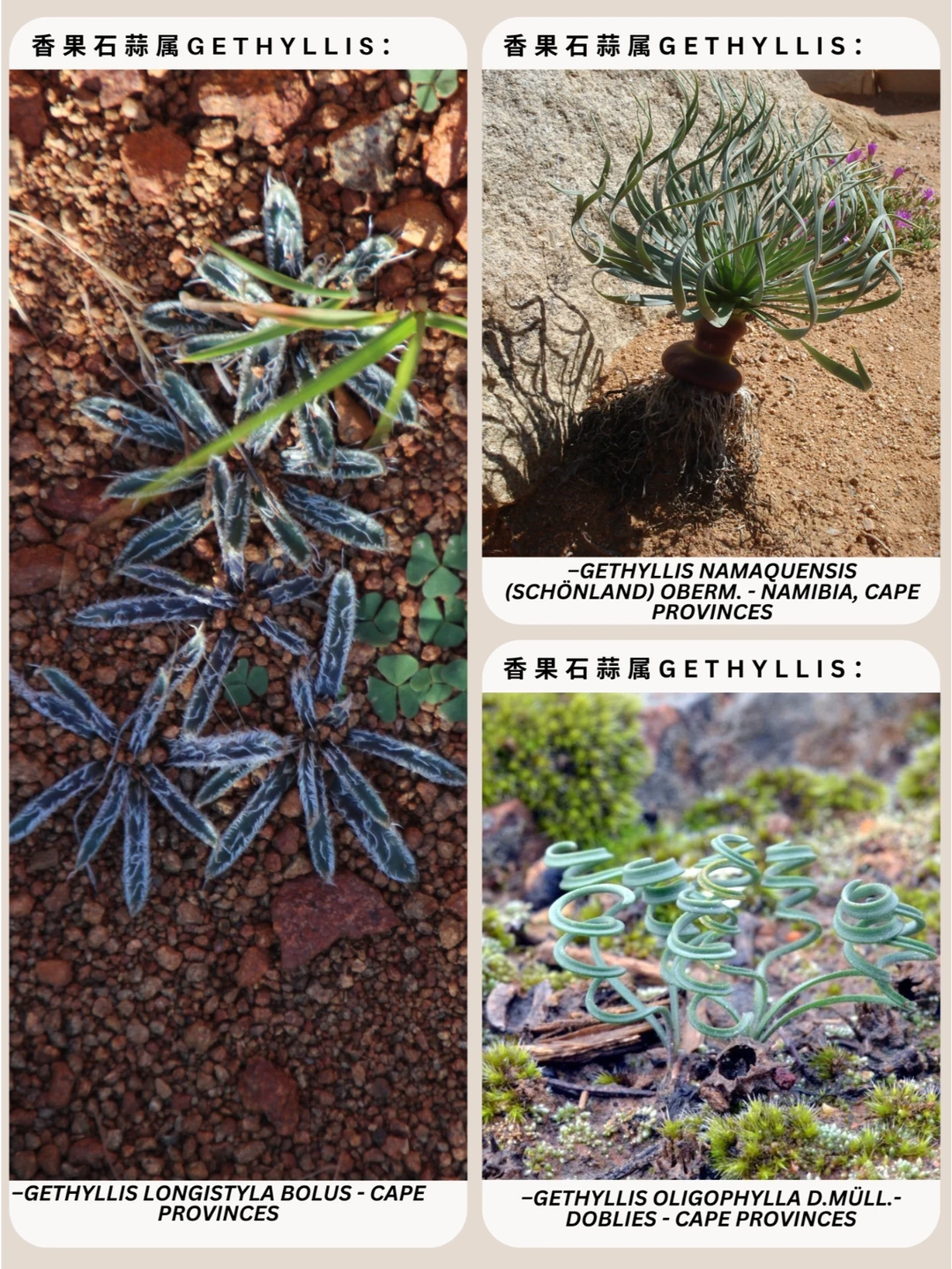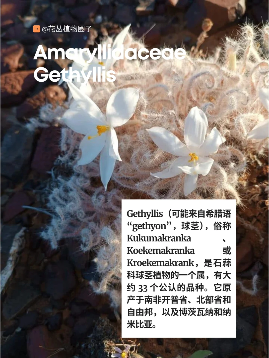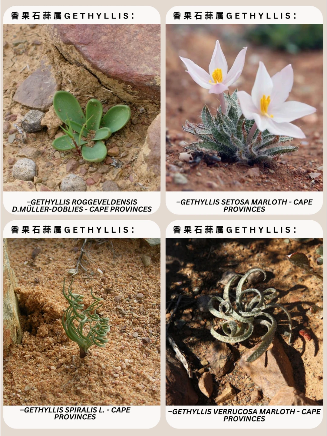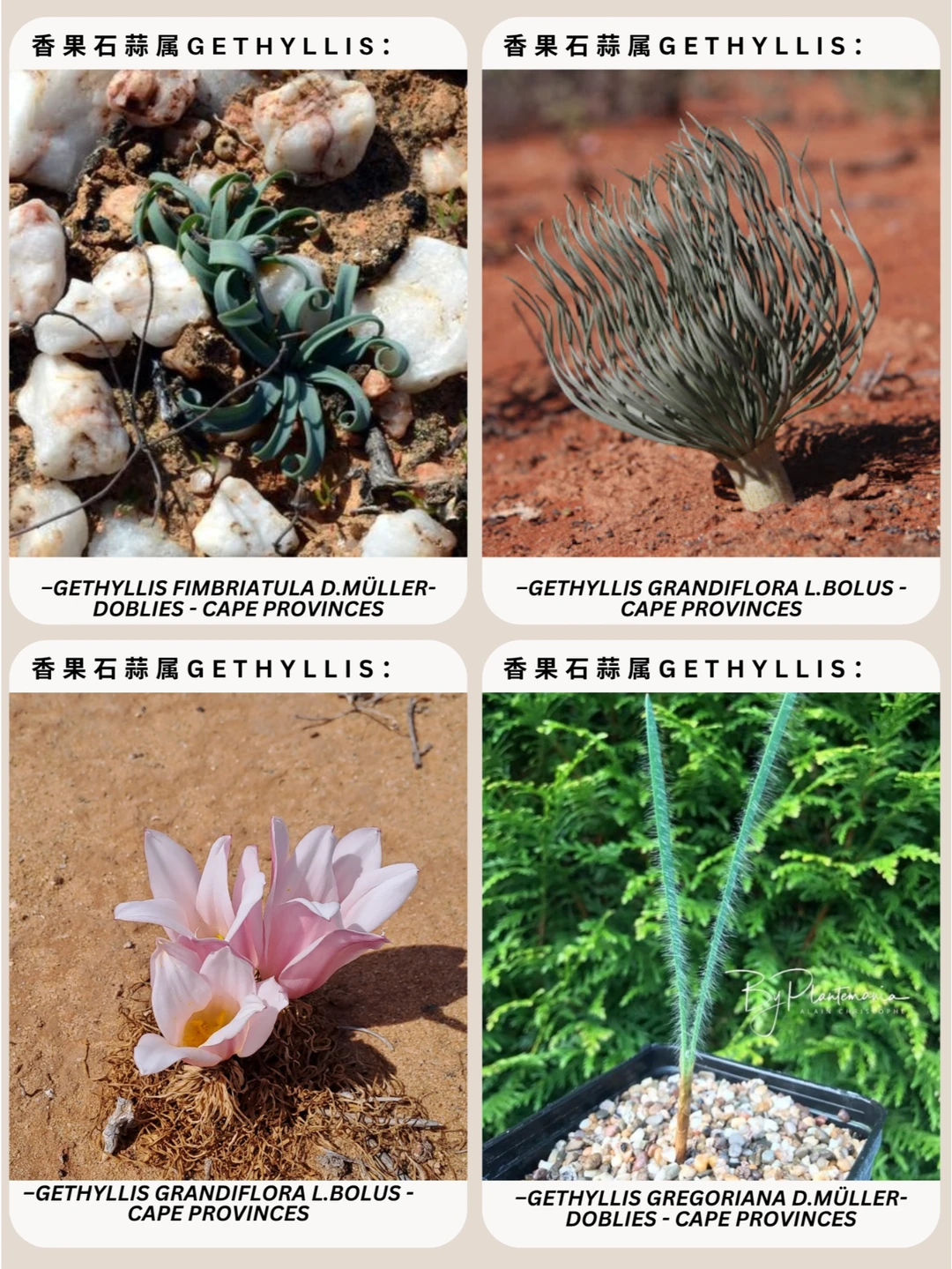 山野草 石蒜科 香果石蒜 弹簧草 南非 开普省 多肉植物 盆栽 Gethyllis(可能来自希腊语 “gethyon”,球茎),俗称 Kukumakranka、Koekemakranka 或 Kroekemakrank,是石蒜科球茎植物的一个属,有大约 33 个公认的品种。它原产于南非开普省、北部省和自由邦,以及博茨瓦纳和纳米比亚。