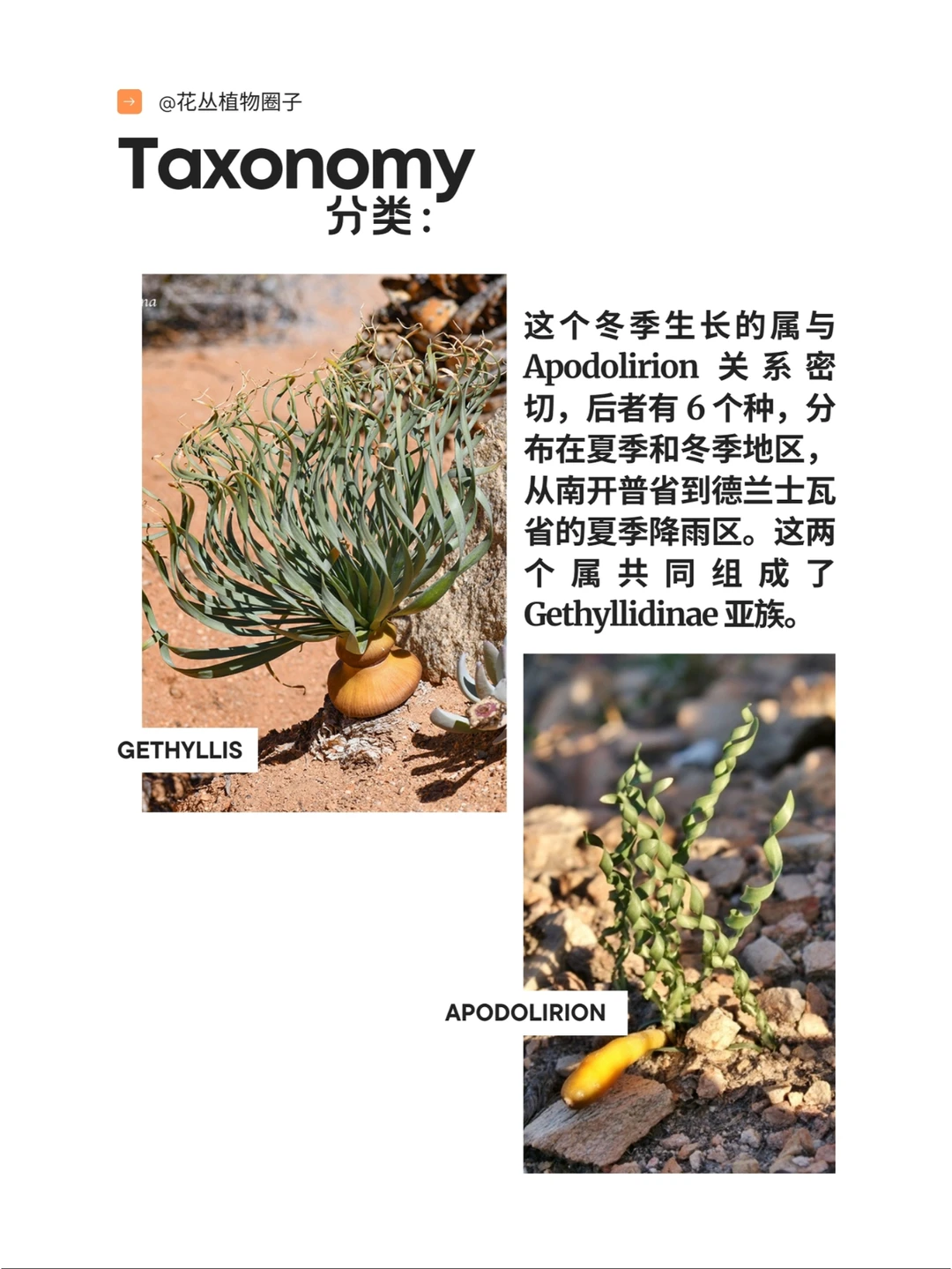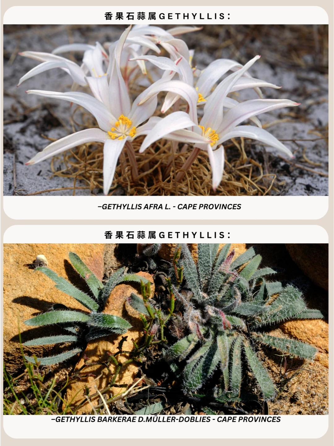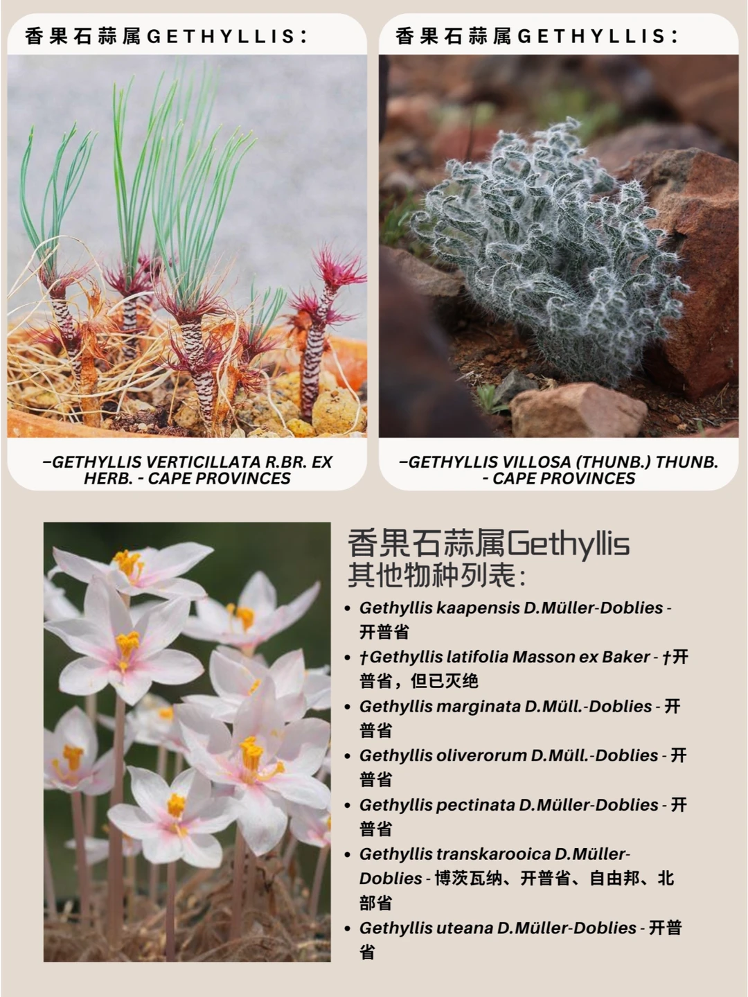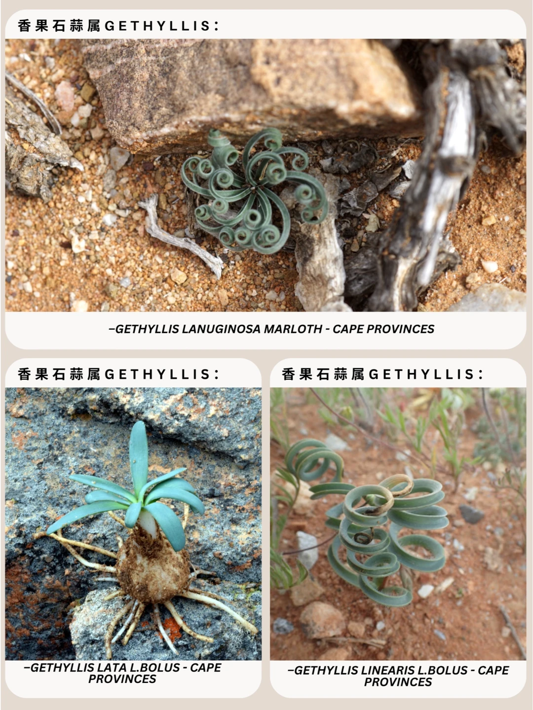 山野草 石蒜科 香果石蒜 弹簧草 南非 开普省 多肉植物 盆栽 Gethyllis(可能来自希腊语 “gethyon”,球茎),俗称 Kukumakranka、Koekemakranka 或 Kroekemakrank,是石蒜科球茎植物的一个属,有大约 33 个公认的品种。它原产于南非开普省、北部省和自由邦,以及博茨瓦纳和纳米比亚。