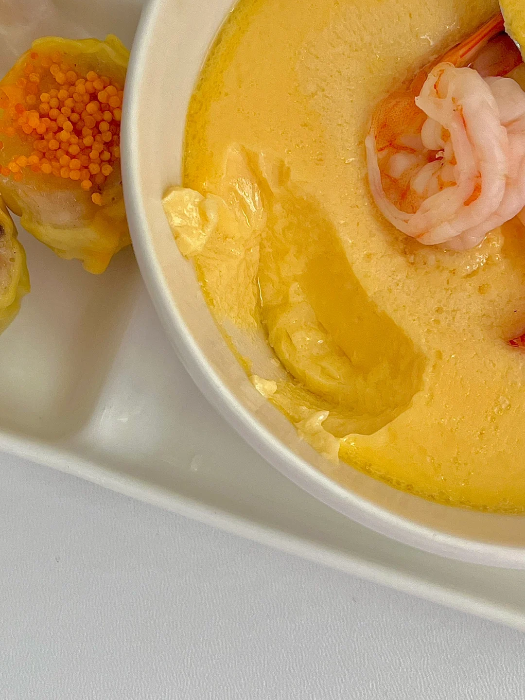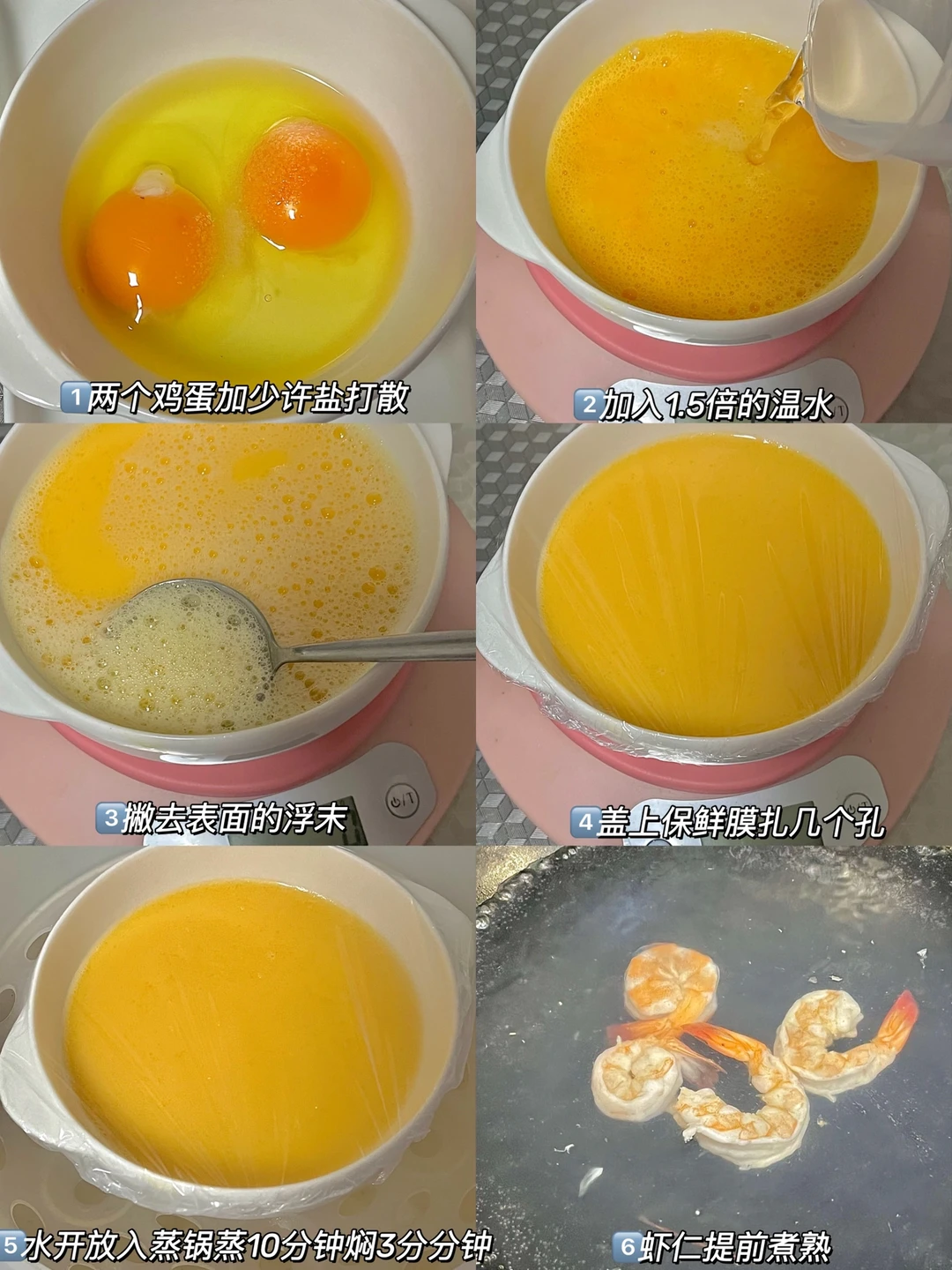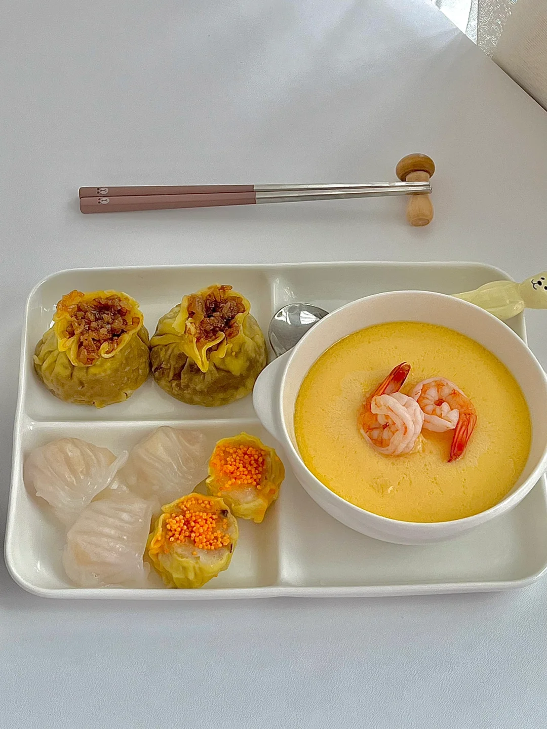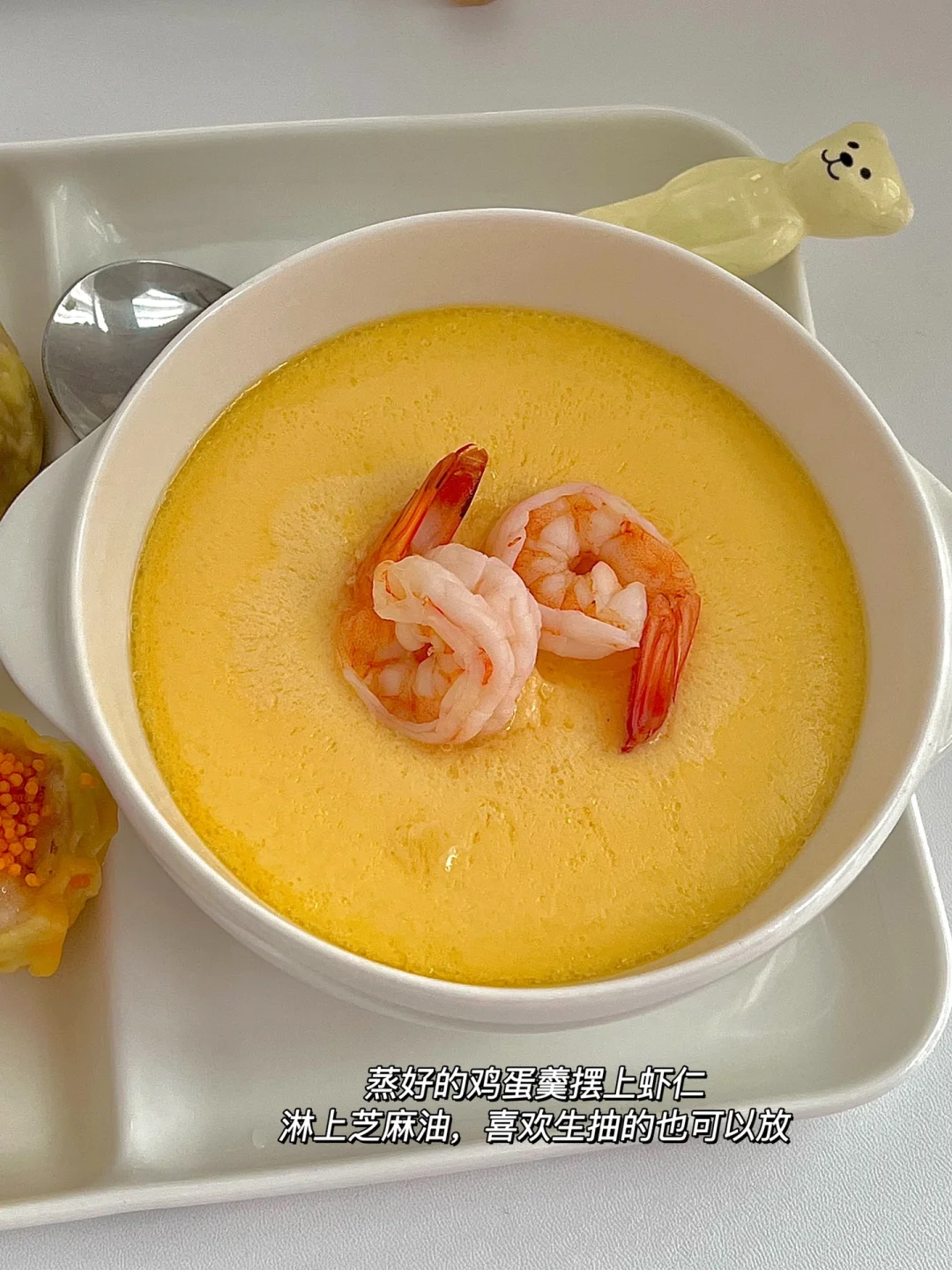 今日份早餐分享: 虾仁蒸蛋 咸蛋黄烧麦 水晶蒸饺 鱼籽虾仁香菇蒸烧麦 . 好久没吃鸡蛋羹了,早起十分钟做个热乎乎的蒸蛋 1️⃣两个鸡蛋加适量盐打散。 2️⃣加入蛋液的1.5倍温水搅拌均匀。 3️⃣盖上保鲜膜扎几个小孔 4️⃣放入蒸锅开锅蒸10分钟焖3分钟。 5️⃣虾仁提前煮熟,摆在蒸蛋上,撒点芝麻油。吃的时候也可以放点生抽。 . 好久没做了,蒸的也不是太好。 简单的中式早餐完成,吃碳水真的让人开心😃