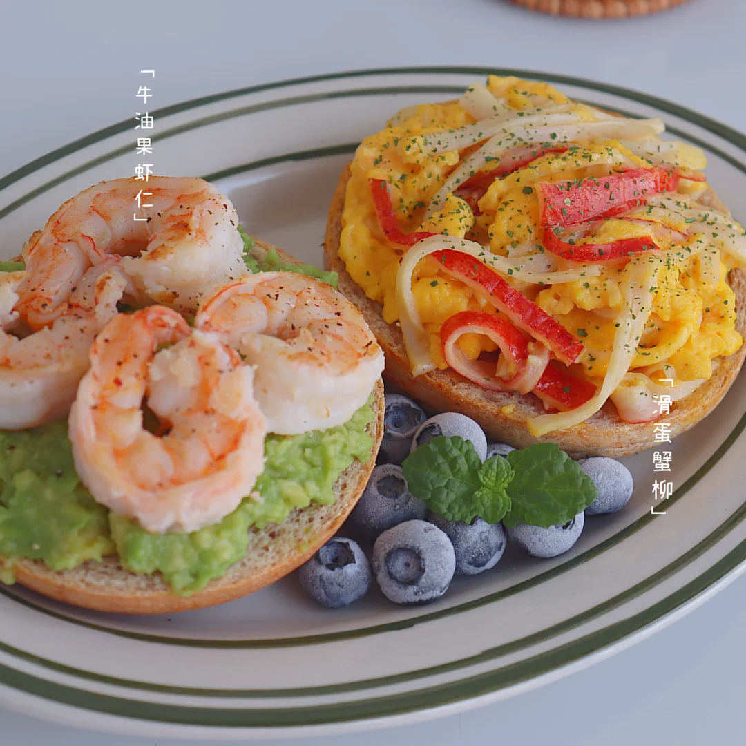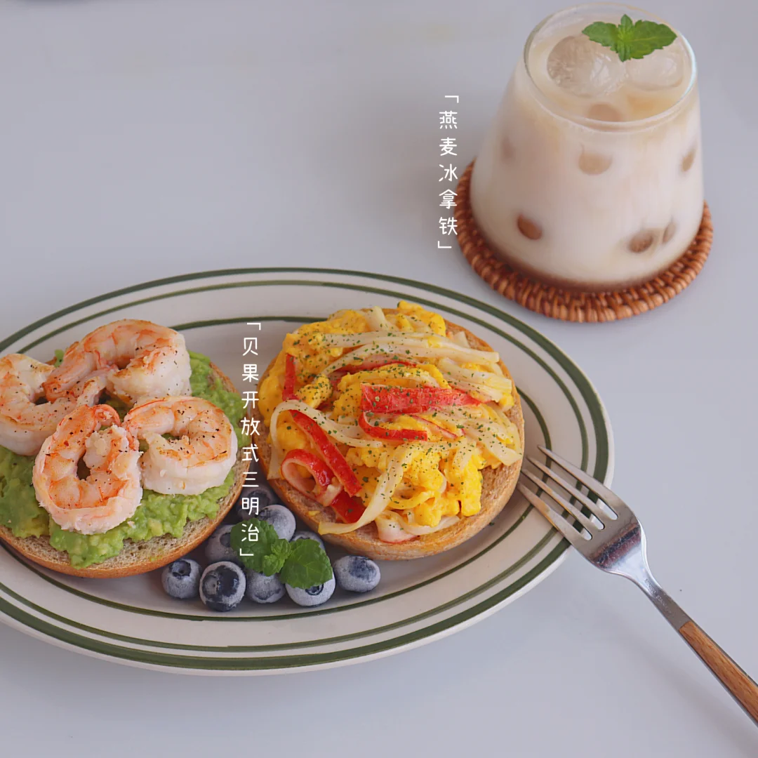 今日份早餐:贝果三明治(虾仁牛油果和滑蛋蟹柳)蓝莓,燕麦冰拿铁☕️ ✨今早又是十分钟快手早餐,这样的早餐永远吃不够😋明天又是周末了,今天努力搬砖💪🏻