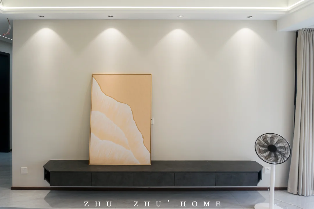 4⃣没有做复杂的电视背景墙,悬空电视柜点缀,挂幕布做投影