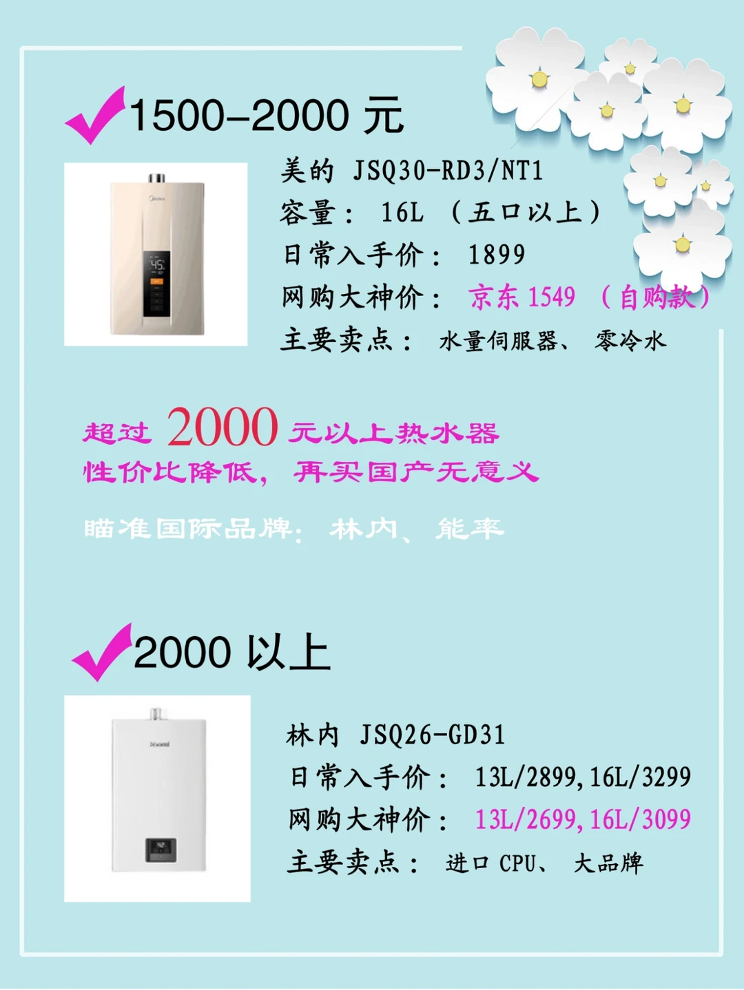 不懂就问有问必答 不懂就问有问必答 对比上百款热水器 精选9款热门燃气热水器推荐(图中两款为朱朱自用款) . [彩虹R]600元内 选12升容量,水气双调配置 . [彩虹R]600-800元 选13升容量,水量伺服器 . [彩虹R]800-1200元 选16升容量,水气双调 . [彩虹R]1200-1500元 选16升容量,水量伺服器 . [彩虹R]1500-2000元 选16升容量,水量伺服器,零冷水 玻璃全面屏,双增压 . [彩虹R]2000元以上 选林内、能率等进口品牌 .