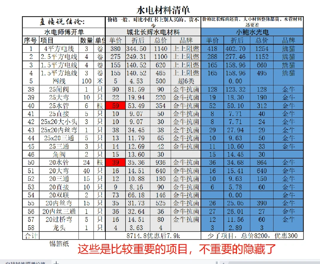 水电材料主要是电线、水管、弯头(内丝弯、内丝三通),其他差别不大
