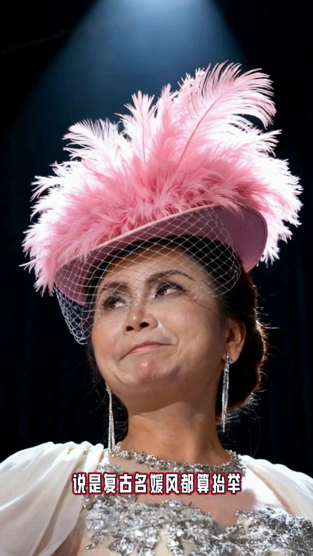 头顶粉色羽毛帽,说是复古名媛风都算抬举,整体像从婚庆公司清库存淘来的。透明纱质上衣薄得像保鲜膜,水钻歪歪扭扭,宽披风走路时活像裹着一床被单,耳坠努力配合豪门阔太人设却闪得不够自然。
