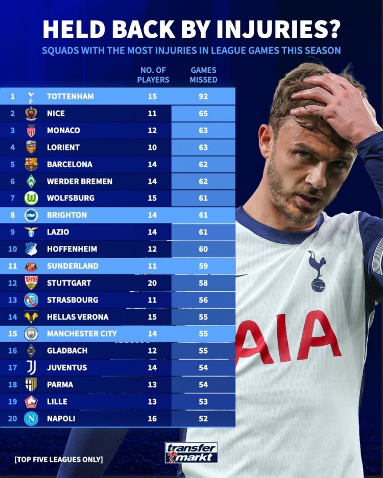 直播吧11月25日讯德国转会市场统计了本赛季五大联赛球队的球员伤缺场次,并列出榜单,热刺15人次累计伤缺92场最多,巴萨14人次伤缺62场第五。