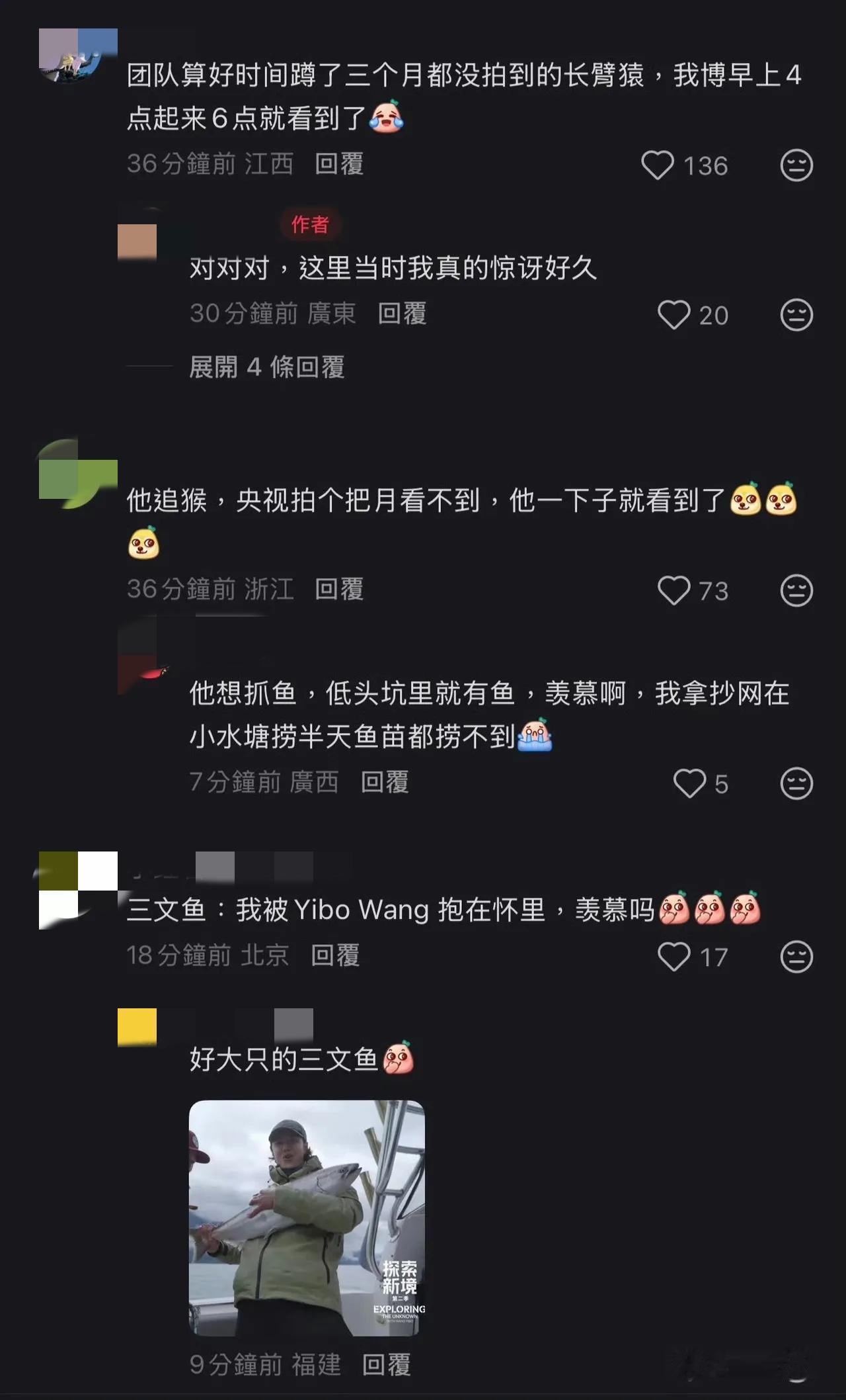 运气这东西…… “网友花2万追鲸三天追不到,海钓一天只上巴掌鱼”[泣不成声] 王一博划个桨板就近距离看到了座头鲸、新手体验钓鱼钓了个大三文鱼(后来放掉了)……… 这不得不让人记起当时《探索新境》第一季雨林寻找长臂猿的情景,央视蹲点好几个月没拍到,王一博4点起来6点就看到了长臂猿还是一家子…… 有时候说“运气”,说“玄学”,其实我觉得归根究底在于王一博本人人正心正俯仰无可愧,才能够福泽深厚处处善缘。 王一博,真“小福星”没错啦[灵光一闪]。 王一博 王一博探索新境2