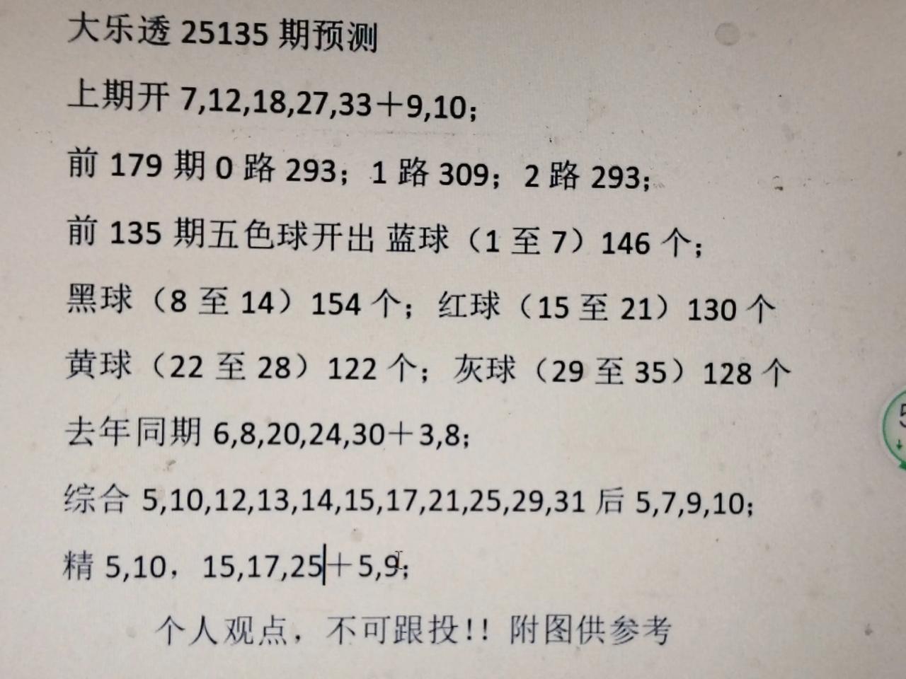 大乐透25135期预测 上期前区开出四个0路号,一个1路号,无2路号。0路与2路比1路号仍少16个号。本期估计1路10,25,2路5,14,17,29,32有号开出。上期猜到4十2。 后区上期开出全蓝波号大数,对。本期估计有重号。5,7,9,10有号开出! 希望大家在年底中大奖!