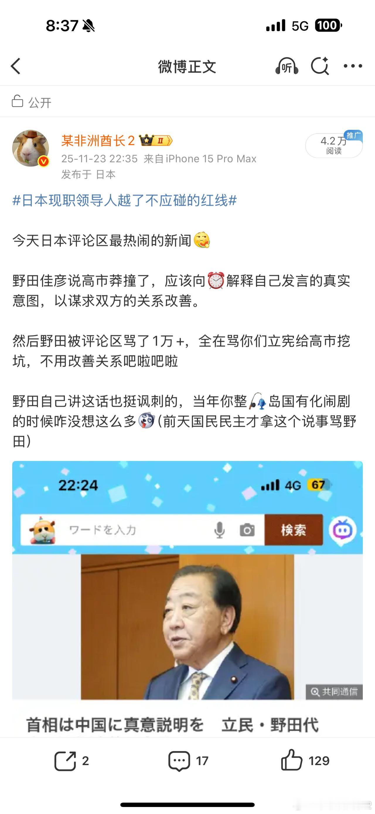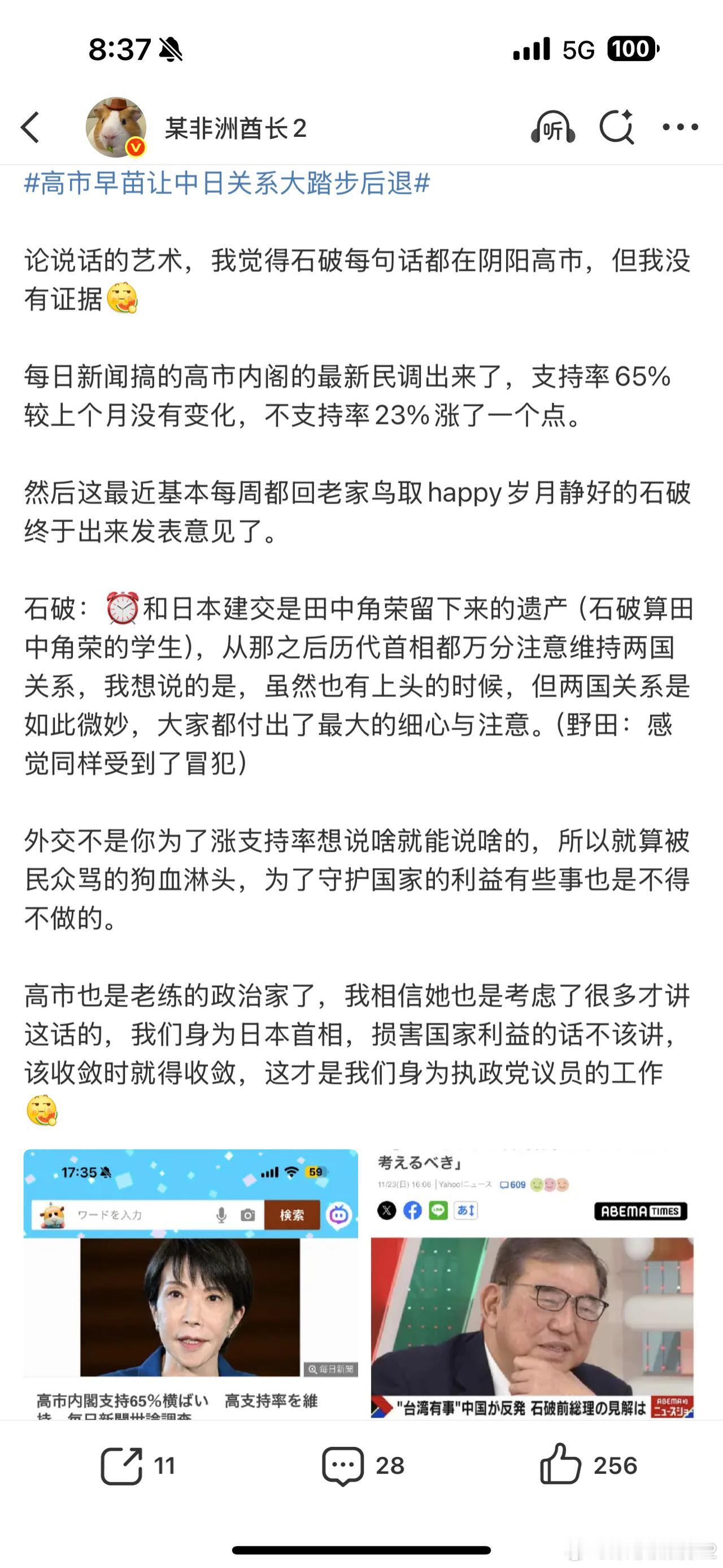三位前首相鸠山由纪夫、野田佳彦和石破茂,再次对搞事小苗发出警告。但估计搞事小苗左耳听右耳出,或者是鸭背浇水,根本听不进去劝,想要一条路走到黑。实际上三位前首相知道,就算搞事小苗现在道歉辞职,也压不住事态发展。事态的发展就是会把日本这么多年悄悄咪咪发展的那些见不得光的东西打掉,打断日本想恢复正常军队的美梦。这才是三位前首相一而再再而三提醒搞事小苗的目的,但搞事小苗看不懂,很多日本人自己也没看懂。