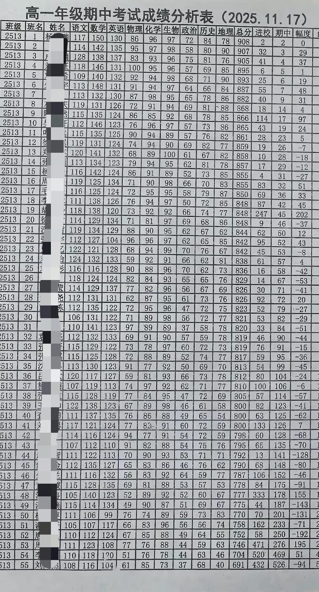 高一期中考试成绩前三名同学很厉害总成绩超900分,第一名同学总成绩908分,语数