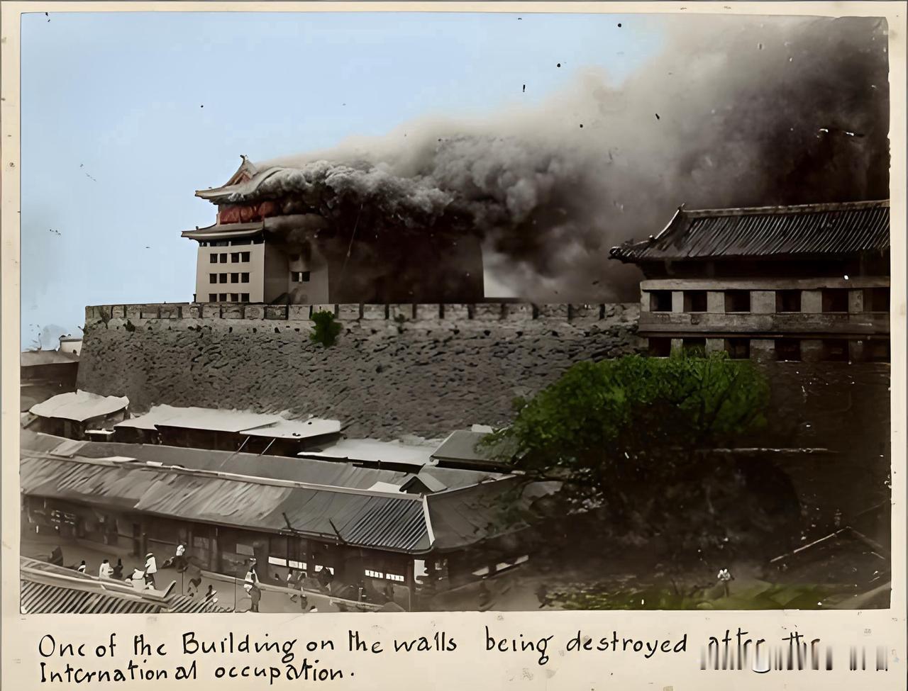 这张照片是1900年八国联军侵华占领北京后的珍贵历史影像,记录了列强侵略对中国城市建筑的破坏,画面主体是北京古城墙及城墙上的中式楼阁建筑——城墙上的传统楼阁正冒出浓重黑烟,处于焚毁破坏的过程中;前景是北京老城的民居屋顶,城墙下依稀可见行人,更反衬出建筑焚毁的突兀与残酷。照片下方的英文注释“One of the Buildings on the walls being destroyed after the International occupation”(“国际占领后,城墙上的建筑之一被摧毁”),直接点明事件背景:“International occupation”即八国联军对北京的军事占领。