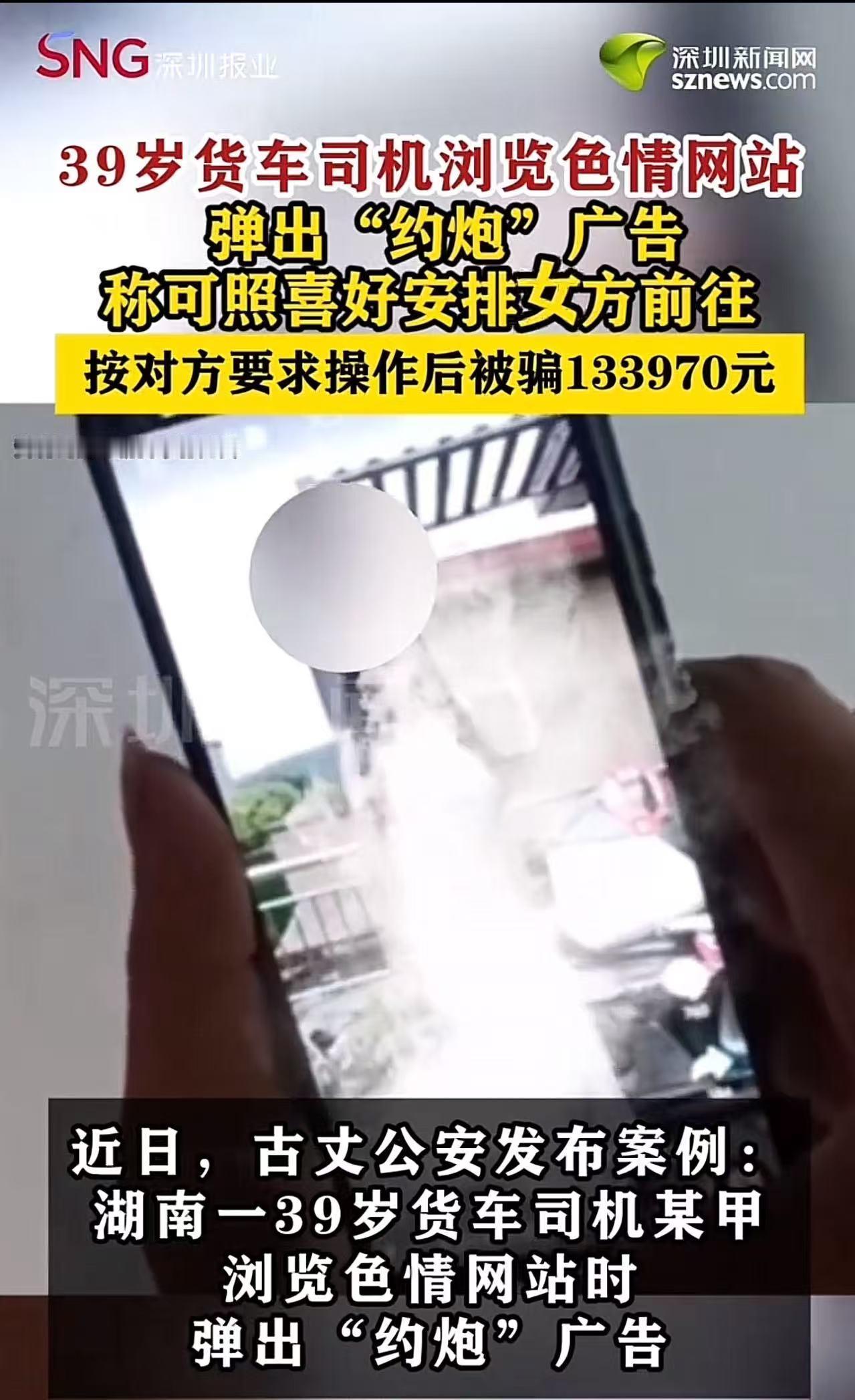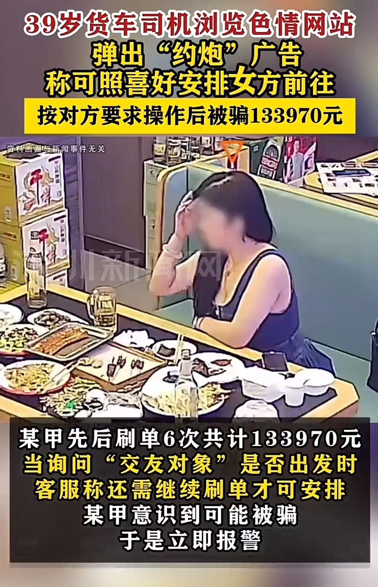 “色字头上一把刀!”湖南,39 岁货车司机浏览色情网站,弹出“约炮”广告,上面的女人看的他热血澎湃,就想找一个“放飞”一下自我!但他按客服要求操作后,被骗 133970 元。司机:“这么多钱没了,连女人的手也没摸到,太难受了!”网友:这13万要拉着货跑多少公里才能弥补! (来源:深圳新闻网) 货车司机贾师傅(化名),常年奔波在高速路上,风餐露宿,日子辛苦又单调。 这天深夜,他刚结束一天的长途运输,疲惫地靠在服务区的车里,想刷手机放松一下。 鬼使神差地,他点进了一个色情网站。屏幕上那些露骨的画面让他越看越上头,整个人像被施了魔法,满脑子都是“放飞自我”的念头,甚至幻想自己能成为片中的男主角,和女演员们“深入交流”。 就在这时,一个“约炮”广告突然弹了出来——画面里的女人个个妩媚动人,身材火辣,贾师傅看得血脉偾张,心跳加速,仿佛下一秒就能和她们“亲密接触”。 欲望冲昏了头脑,他顾不上多想,立刻添加了广告里的客服。 客服告诉他:“为了保证美女的安全,你得先完成刷单任务,我们会根据你的喜好安排‘交友对象’到你所在地,任务完成后,钱还会全额返还。” 贾师傅当时精虫上脑,根本没怀疑这是骗局。他像被操控的木偶,按客服要求刷了6次单,总共转了133970元——这可是他跑车攒下的血汗钱啊! 可当他兴奋地问“美女什么时候到”时,客服却说:“还得继续刷单才能安排。” 贾师傅卡里的钱已经没 了,这才如梦初醒,意识到自己被骗了,赶紧报了警。 民警一查,对方确实是骗子。而钱转出去,想要追回来就难了! 得知真相的贾师傅,哭丧着脸说:“这么多钱没了,连女人的手都没摸到,太难受了!大家一定要吸取我的教训!” 贾师傅的遭遇,看似荒唐,实则发人深省! 骗子利用人性中最原始的冲动,用色情广告当诱饵,用“刷单返利”当幌子,一步步把受害者拖进深渊。 更可悲的是,贾师傅们往往不是“无知”,而是“侥幸”——他们总觉得“自己不会那么倒霉”,总觉得“刷完这单就能见美女”,可现实是:你越贪婪,骗子越猖狂;你越冲动,陷阱越深。 这起事件也暴露了一个残酷真相:在色情内容的诱惑面前,人的理性脆弱得像一张纸。 贾师傅作为货车司机,本该靠双手勤劳致富,却因为一时欲望,把辛苦攒下的钱拱手送人,甚至可能面临家庭破裂、债务缠身的后果。 那些还在幻想“网上约炮”的人,醒醒吧!色情网站是骗子的温床,“刷单返利”是诈骗的套路,你看到的“美女”可能是抠脚大汉,你转的“保证金”可能永远要不回来。 记住:欲望可以理解,但必须克制;贪婪可以理解,但必须警惕。 别让一时的冲动,毁掉你的一生;别让贪婪的念头,让你成为骗子的“提款机”。 “洁身自好,遵守法律”,这不仅是道德要求,更是生存智慧——抵制色情诱惑,远离非法交易,才是保护自己、守护家庭的底线!