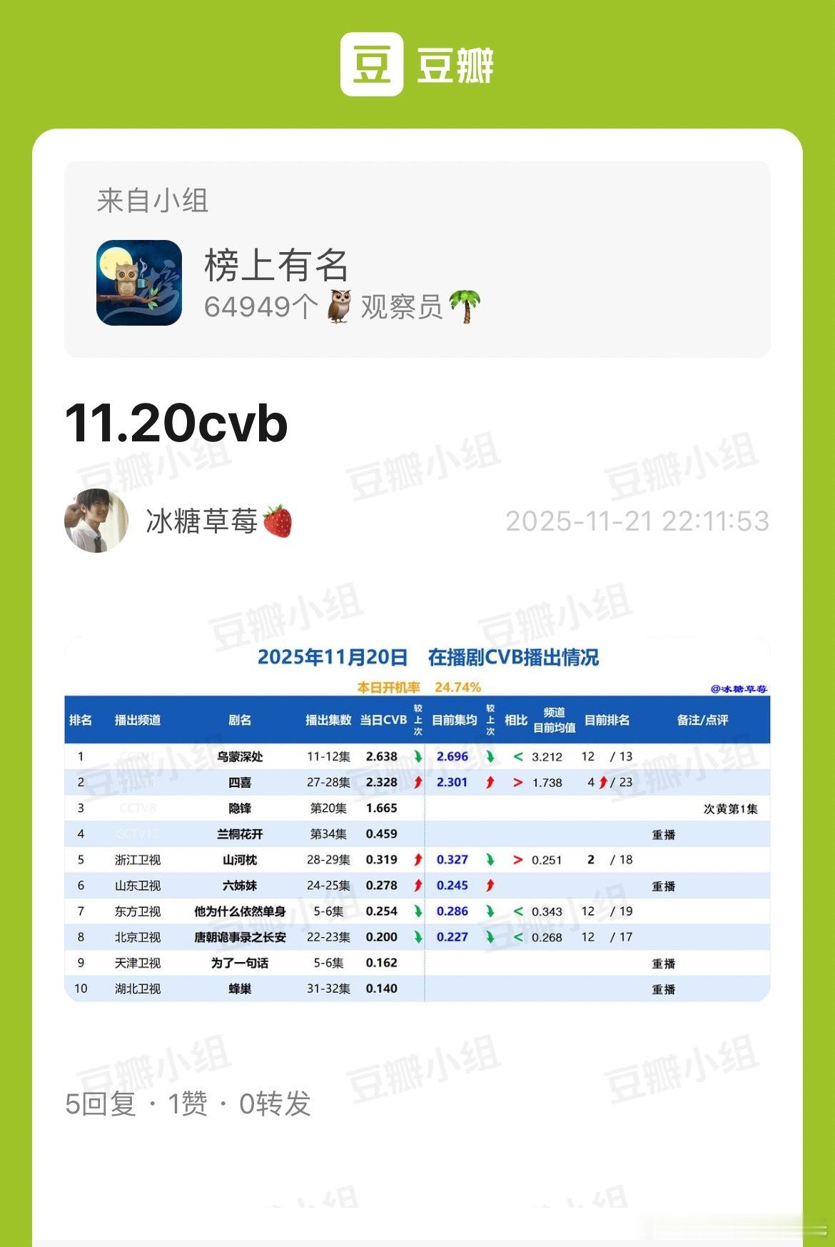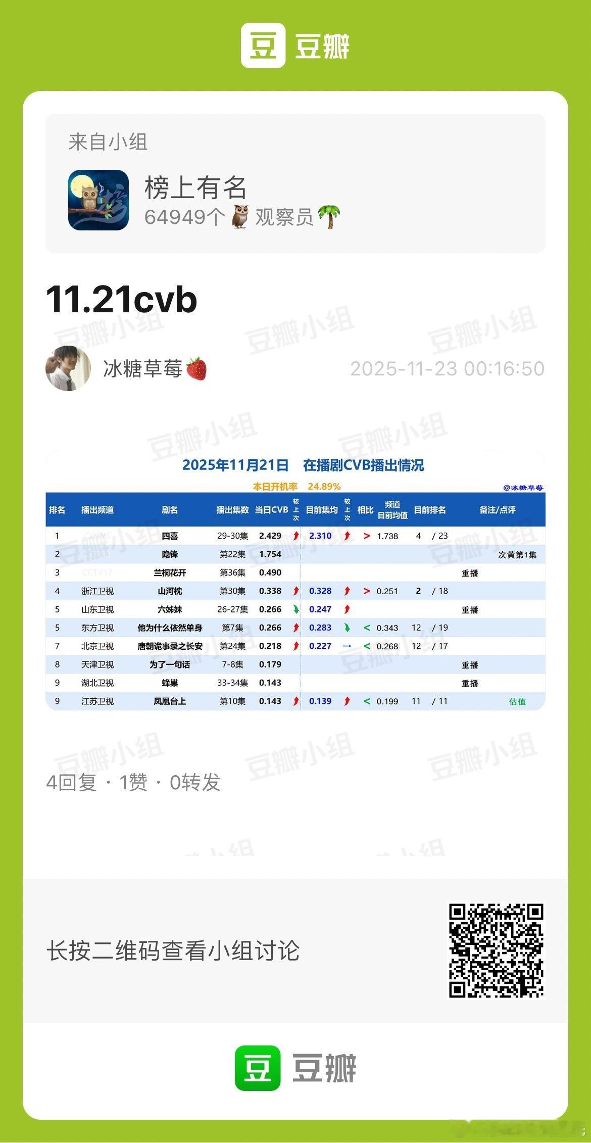 11.20-11.23CVB收视率 集均2.341央八第4了集均 0.329,浙