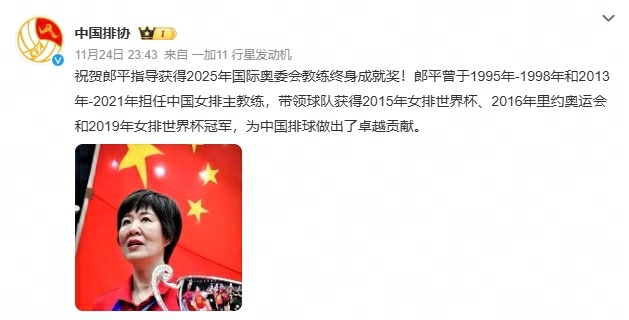 据国际奥委会官方消息,中国女排传奇 获得国际奥委会颁发的教练终身成就奖。“获得这个奖项是莫大的荣幸,”郎平说。“我由衷感谢国际奥委会和国际排联对我执教工作的认可。我要感谢的人太多了——从我在中国、意大利和美国执教过的优秀队伍和球员,到从我接触这项运动之初就塑造我球技和人格的教练和导师们。这份荣誉属于他们所有人。” 也发文祝贺:祝贺郎平指导获得2025年国际奥委会教练终身成就奖!郎平曾于1995年-1998年和2013年-2021年担任中国女排主教练,带领球队获得2015年女排世界杯、2016年里约奥运会和2019年女排世界杯冠军,为中国排球做出了卓越贡献。祝贺这位伟大的运动员、伟大的教练!