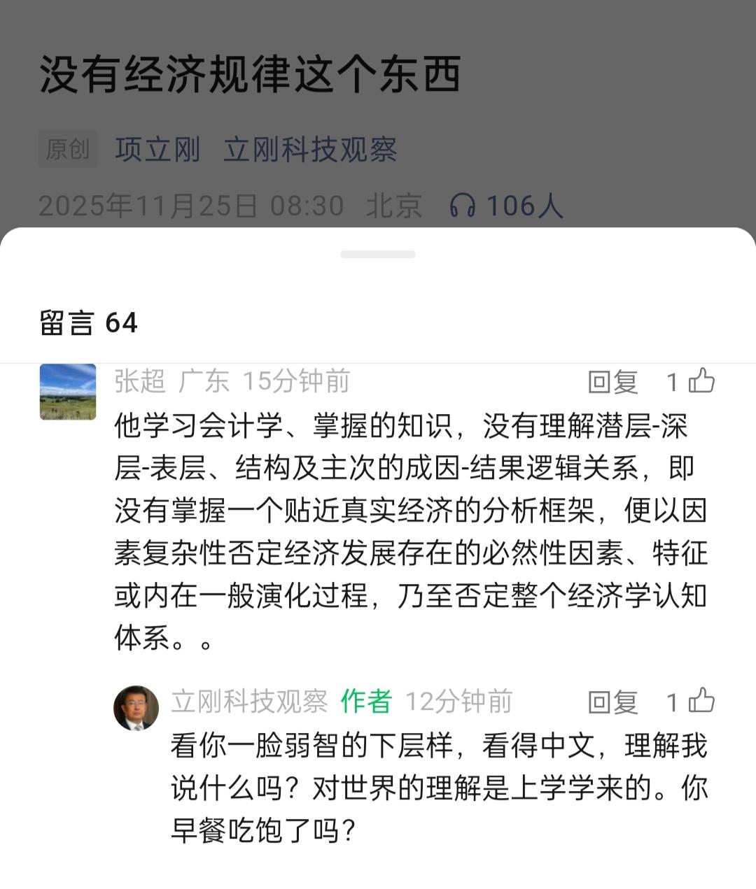 项立刚先生怒火冲天。11月25日早上8点多钟,项立刚先生写了一篇文章,文章的名称是《没有经济规律这个东西》。 有网友反驳项立刚。这位网友反驳的大概意思是,从项先生所学的专业来看,谈这类问题应该是项的短板。 项立刚一看此话,怒不可遏,将这位网友怒批了一顿。 在网上交流,还是要语言温和、文明交流,这也是很多社交平台所说的正能量。