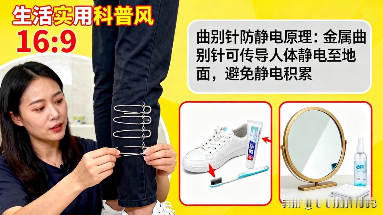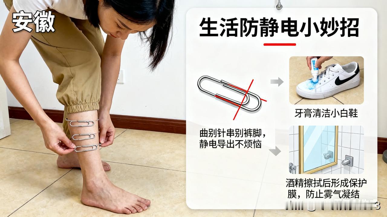 冬天到了,静电成了不少人的困扰,脱衣服时 “噼里啪啦”,握手时还会被 “电” 一下。不过安徽有位女子想出了零成本的解决办法,她用 3 个曲别针串成串别在裤脚,当 “人工地线”,轻松解决了衣服粘腿、身体触电的问题,网友还调侃这是 “静电与穷的奇妙缘分”。 其实,曲别针能防静电是有原理的。静电是静止状态的电荷,不同物体接触分离会产生电荷。曲别针是金属材质,能把静电导走。 生活中,利用小物件和常识解决问题的例子不少。比如用牙膏清洁小白鞋,用酒精擦镜子防雾。大家也可以分享一下自己的小妙招,一起用低成本解决生活大问题!