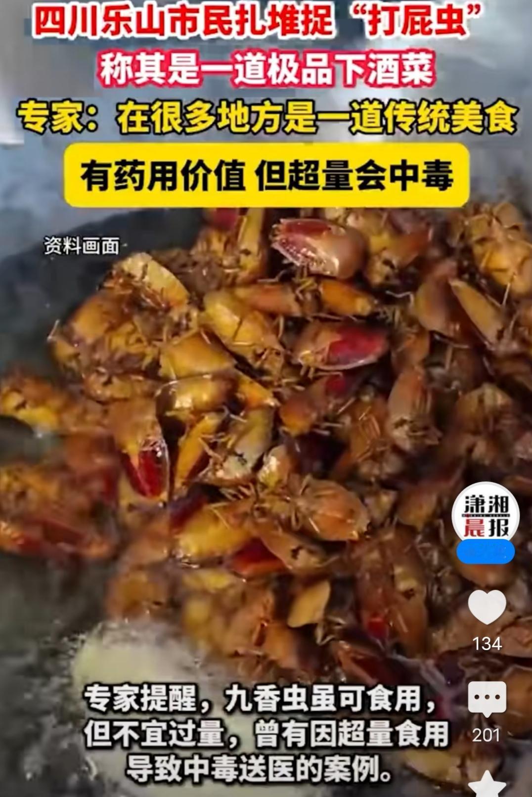 又开眼界了!四川乐山市民扎堆捉“打屁虫”,约500元/斤,专家:在很多地方是一道传统美食!天啦,刚在相关媒体平台看到这个消息的,看了两三遍,确认就是我小时候老家印象中那种虫子,我们那也叫它“打屁虫”,因为它放的一种气味真的很臭。 我从小就讨厌虫一类的东西,刚刚看到这个报道真的让人难以置信,居然还扎堆捉那种东西,居然还高达500元一斤,专家居然说在很多地方还是一道美食!回想起它们放屁那种恶臭,再看到图片里长的样子,我真的无法将它们与美食挂钩! 当然了,专家也提醒了,再美味也不要过量,因为吃多了有中毒的危险,说是曾经有过吃多了中毒的案例,反正我是绝对不会吃这种东西的,想想都恶心,根本下不了口。 看到这个,不由得让我想到了近在身边的,就附近的烧烤店,其中有一项就是烤蚂蚱,之前跟老公的徒弟们一起吃烧烤的时候,他们就点了烤蚂蚱,美其名曰高蛋白,脚丫,翅膀呀这些一起烤的,没有处理,我是看着都不舒服。 但是,我那几岁的小宝,居然不怕,她居然敢吃。任凭谁劝我尝试,我也不会吃,看着样子,难以下口! 友友们,你们那会把这些虫子一类的东西当美食吗?你们敢吃吗? 社会百态