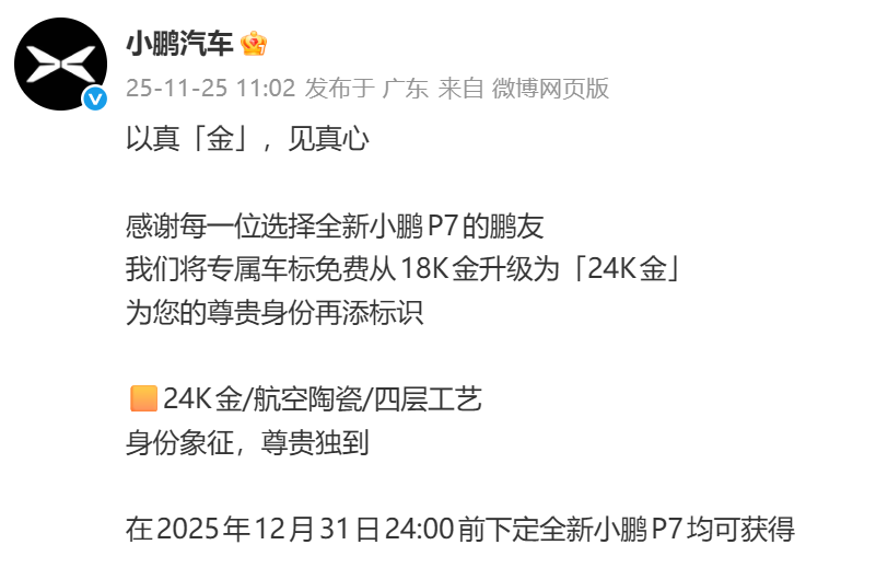 小鹏:全新小鹏P7车标限时免费升级为24K金