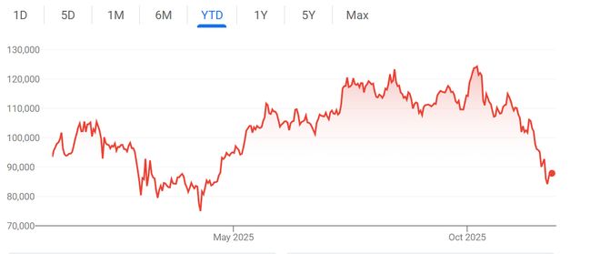 而这些财富损失的主要原因,就是自10月初以来加密货币价格的暴跌。目前,比特币已完全陷入熊市,较约12.6万美元的高点下跌了超过30%。