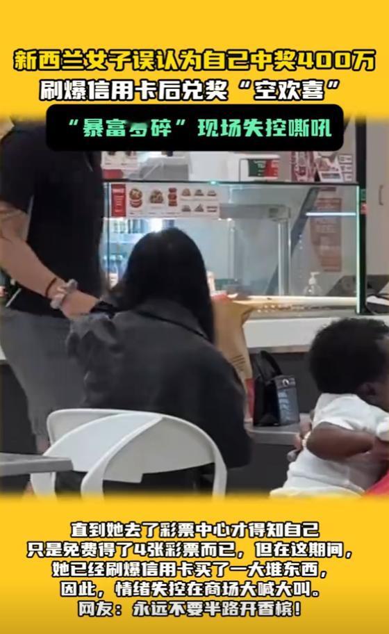 [太阳]乐极生悲了吧?新西兰一女子买彩票中了400万,刷爆信用卡买东西庆祝,结果等了几天,也没被邀请兑奖,她自己去了彩票中心,人家说她只是中了4个bouns,就是免费送她4个彩票而已,女子瞬间情绪崩溃,一边大喊一边扇自己耳光! 据搜狐新闻11月24日报道,越来越多的人希望自己一夜间暴富,这名女子也不例外。   原本女子只是随手买了几张彩票,对中奖并不抱太大希望,但在开奖后,看着自己手中彩票的页面,由于她在看到“4”这个数字时,直接联想到了后面跟着几串零的大奖金额。   女子没再仔细核开奖单是否正确,也没有通过官方渠道进行任何核实,就认定自己已经成为命运垂青的幸运儿。   所以她以为自己中了大奖400万新币,相当于近1600万人民币。   于是,她开始了一场疯狂的庆祝行动,各种生活中不舍得买的东西悉数收入囊中,甚至连奢侈品也成为她的目标,从珠宝首饰到高档包包,她以一种“挥霍权利”般的姿态刷爆了自己的信用卡。   这段时间,她的心中充满了暴富的满足感,体会着“一夜之间翻身”的兴奋与快感。   她按照流程守着电话,满心期待大奖中心会与她联系,邀请她前往领奖,可是,几天过去,一个电话、短信都没有出现。   也许她起初还有些疑惑,但很快就有了一种“主动出击”的决心,她带着彩票亲自前往兑奖中心,准备迎接自己梦想中的大奖领取仪式。   兑奖工作人员扫描二维码后,仅看了一眼便告诉她结果:她的奖金其实只是“bonus奖”,即赠送的4张免费彩票。   瞬间好似一盆冷水浇灭了她的所有期待,她在兑奖大厅里情绪彻底崩溃,哭喊着质疑工作人员欺骗她。   女子的错觉究竟从何而来?心理学上有一个叫“锚定效应”的现象可以解释这种情况。   先入为主的认定和强烈的愿景,让她渐渐丧失基本的判断力,事实是,她并没有仔细核对奖项类型,只沉浸在中奖的幻想里。而冲动消费更是放大了她的错误,从小额支付到刷爆信用卡,她一步步将自己推向更深的财务困境。   这件事暴露出的核心问题,或许不止是误读彩票,而是这名女子太渴望突然暴富,甚至于完全不做风险预判。   在暴富的美梦驱动下,她的思维已经失去了理性,这种盲目行为背后,其实是一种对生活的焦虑和对现实的逃避。   短暂的兴奋掩盖不了损失带来的压力,等到美梦醒来的那一刻,一切又会反扑到她的生活,变得更加沉重。   这场看似荒诞的事件,其实折射出了许多人沉迷于一夜暴富的心理现象,不少人希望通过低概率的博彩游戏迅速改变生活,甚至不愿意面对现实中的努力和积累。   彩票的本质是概率游戏,这是一种对幸运的期待,但绝大多数结果是无果而终。   她的故事也为每一个想通过“捷径”改变命运的人敲响了警钟。   不切实际的梦想和冲动行为往往会将人带入困境,理性和冷静是应对好事与坏事的关键。   有人在这件事后感叹:“中奖原来也是一门学习。”确实如此,如何正确看待彩票的规则和可能性,如何保持理智去面对中奖与否,都是值得思考的话题。   否则,“乐极生悲”的故事随时可能上演,而后果或许比她的信用卡账单更难以承受。   信源:据搜狐新闻2025年11月24日报道——新西兰女子误认为自己中奖400万,刷爆信用卡后兑奖“空欢喜”,“暴富梦碎”现场失控嘶吼