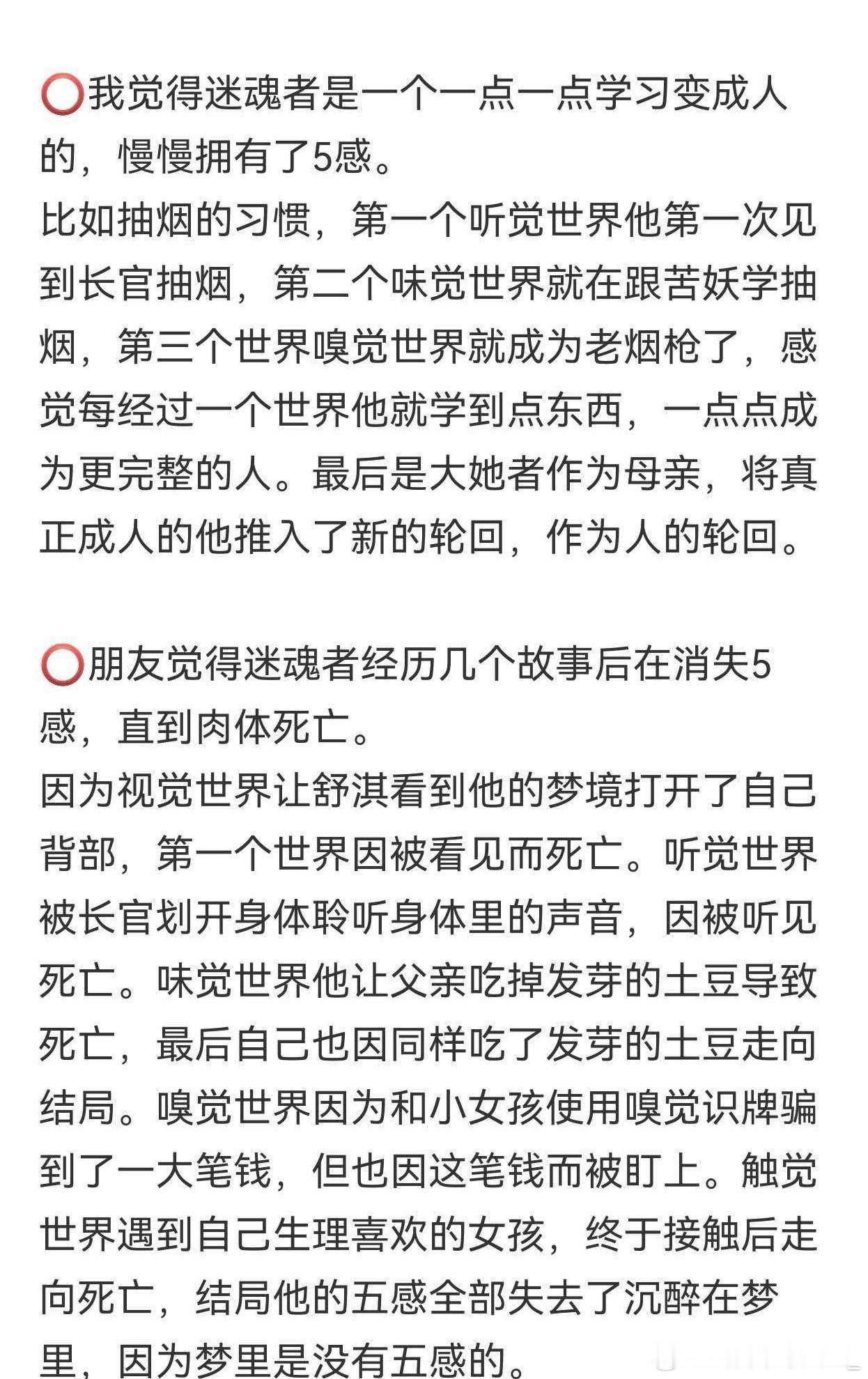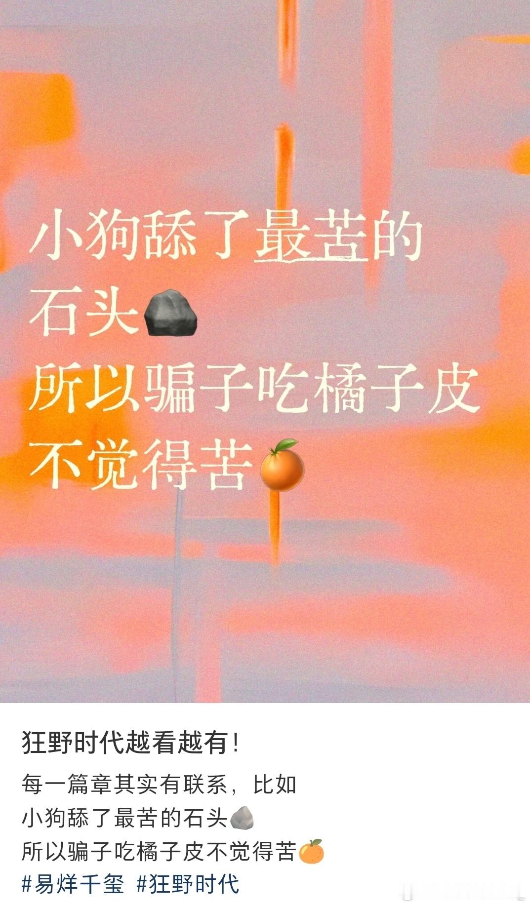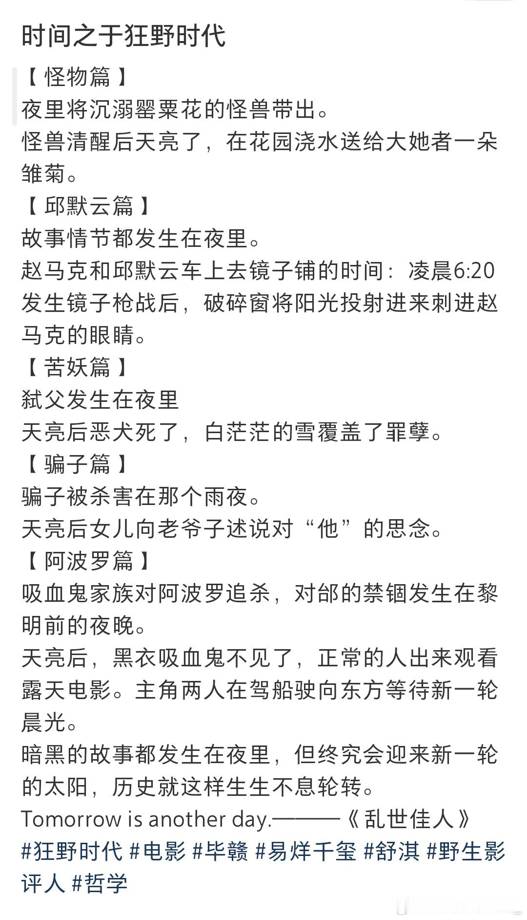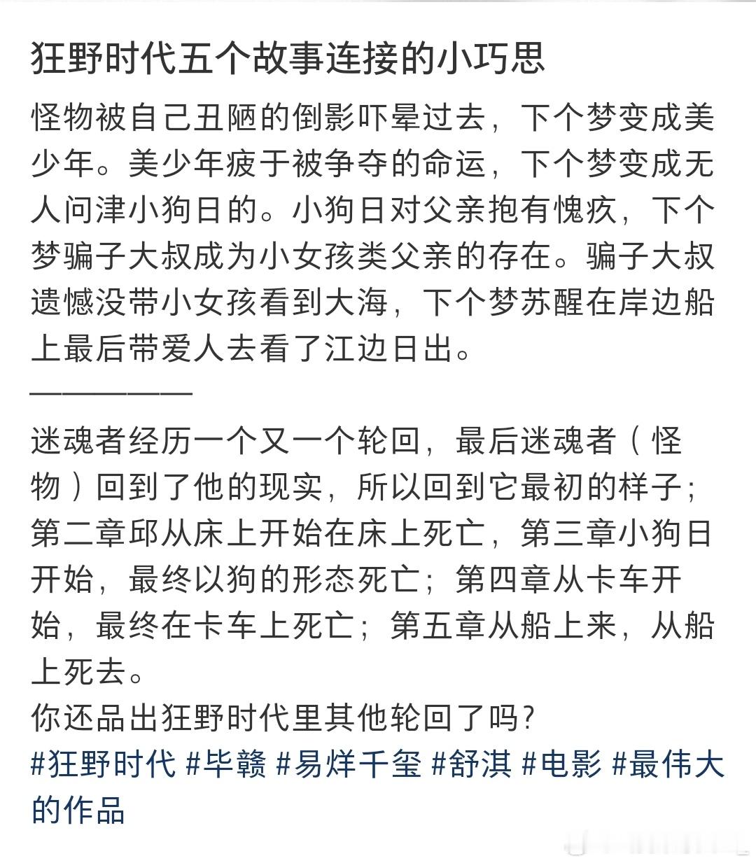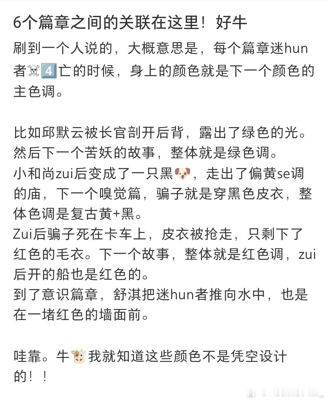 刷到网友们看完《狂野时代》纷纷晒出自己的解读,才发现狂野各个篇章都能够能承上启下且息息相关。从电影的人物成长变化,甚至细节各篇章主色调这种小细节上都有细糠。😍身体溃烂迷魂者在地下城堡被找到,大她者讲他带走,小怪物通过照镜子看到了自己丑陋的样子,下一篇章变成了美少年却身上有伤邱默云;邱的钢笔在雪地小苦瓜手上;小苦瓜没尝到的苦,骗子吃带皮的橘子🍊尝到了;小女孩提到的的“臭屁”,被阿波罗和邰肇玫用肌肤发出噗噗噗声生动展示出来。五感篇章中各有各的细节串联在一起。🤓甚至连颜色都能承接上,长官划开邱的身体冒出绿光,味觉篇就是绿色主色调;小苦瓜变成黑狗,嗅觉篇中年骗子身穿黑皮衣登场(ps🐶的嗅觉也很灵敏哦);骗子皮衣被抢走只剩下红毛衣,触觉篇便红色主色调。《狂野时代》真的越品越不得了,五感是这些篇章的表象,本身五感就构成了完整的人,里面各篇章的息息相关怎么不算是一种交融呢!你还有什么惊喜是我不知道的,真的要太好品了!