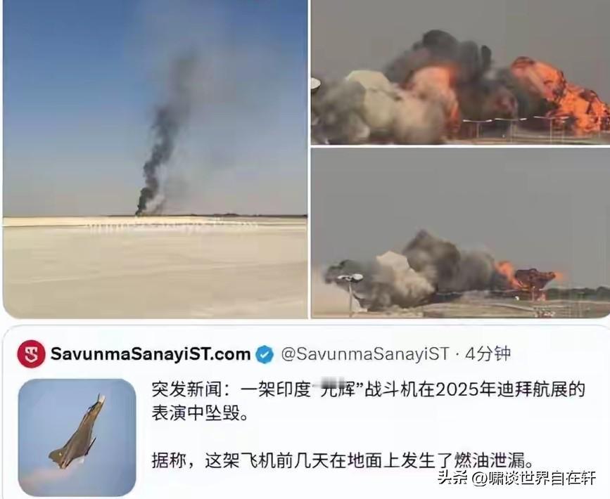 真敢啊! 摔了! 11月21日迪拜航展, 印度一架“光辉”战机, 在参加飞行表演时坠毁。 在这第一感觉就是那, 印度极力遮掩漏油的战机! 果然就是它。 意料之外情理之中, 印度又一特性“淋漓尽致”: 真敢,迎“难”而上。 上次命运多舛的卫星对接亦是, 归根结底就是人的问题, 而这问题在印度身上, 无解!