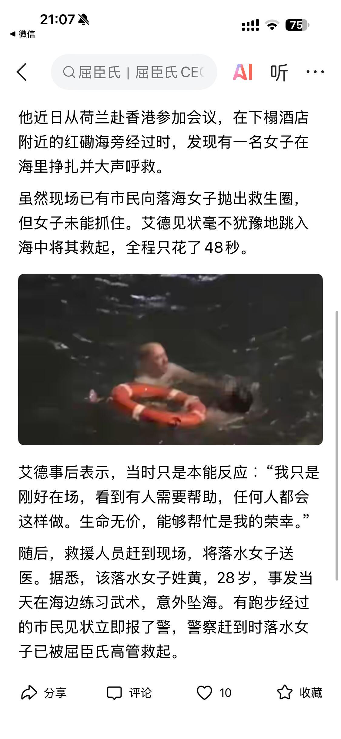 屈臣氏CEO在香港跳海救人,全程只花了48秒