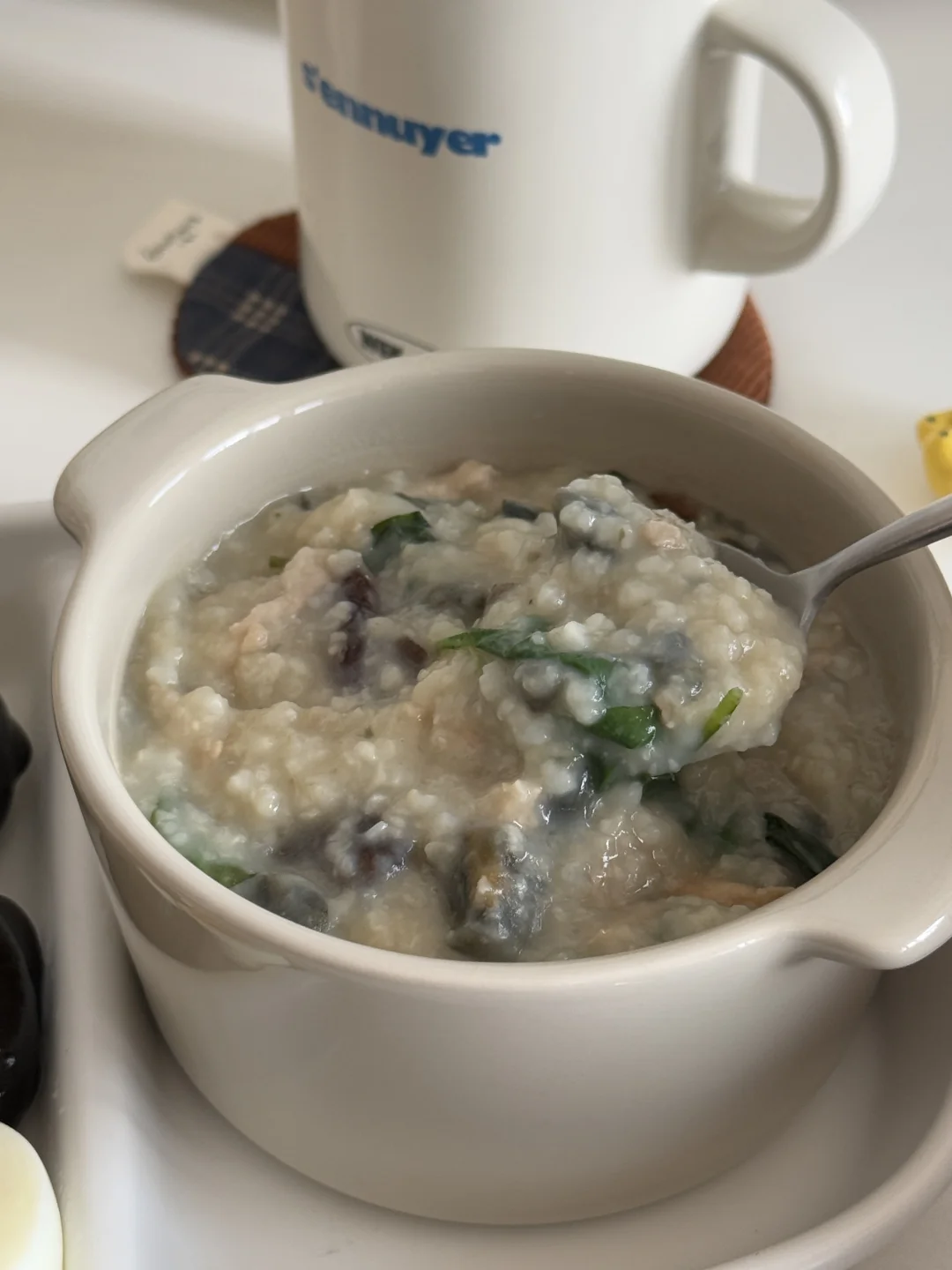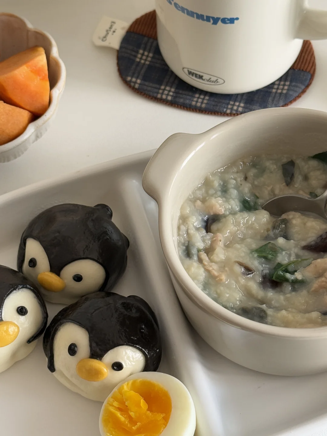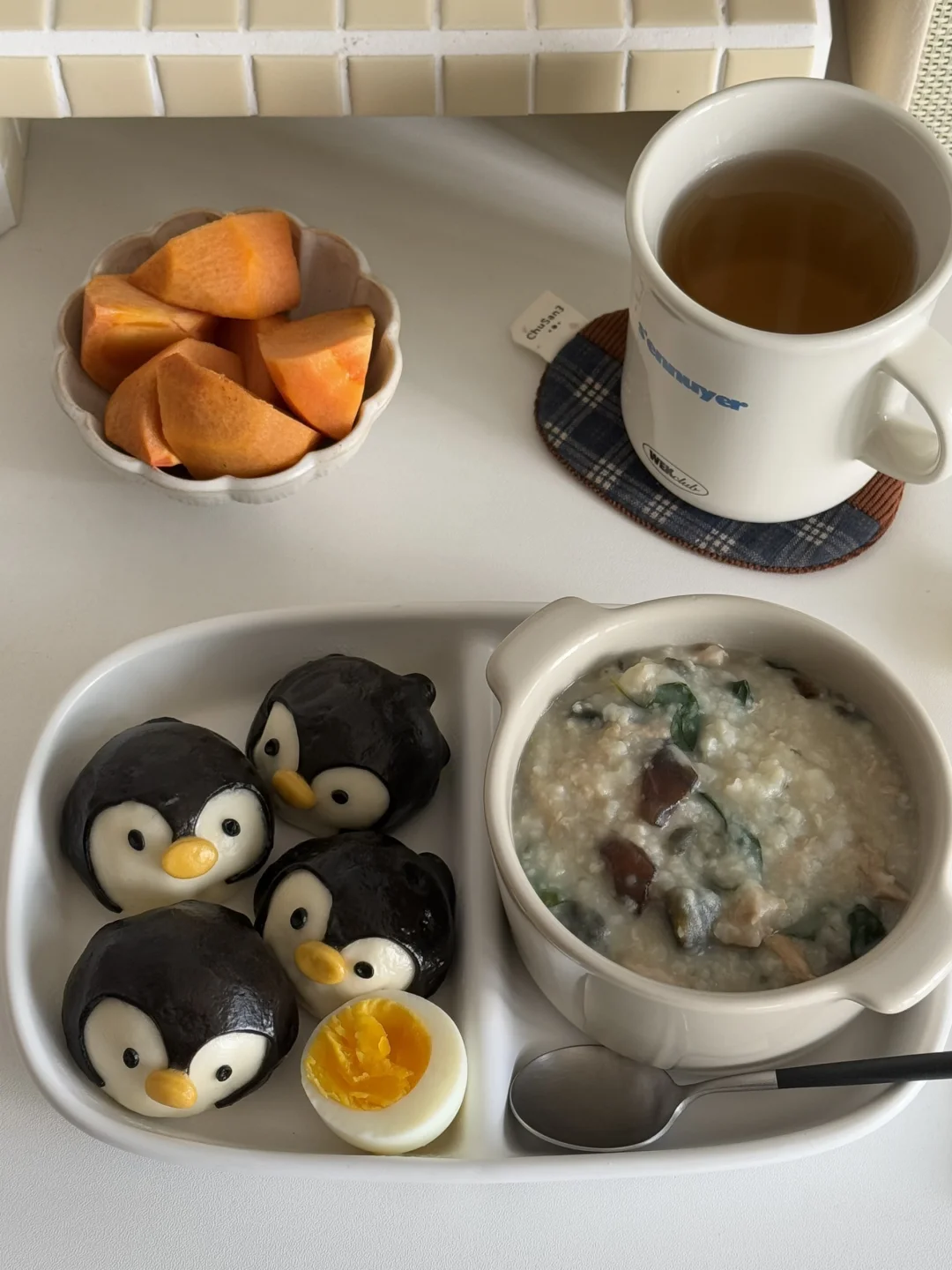 今天吃皮蛋瘦肉粥(枸杞叶版 已经爱上枸杞叶了 不管是做汤还是煮熟 - 今日早餐🥢 - ▪️皮蛋瘦肉粥(枸杞叶版 ▪️卡通🐧虾仁包🥚 ▪️巧克力脆柿 ▪️红枣枸杞水 -