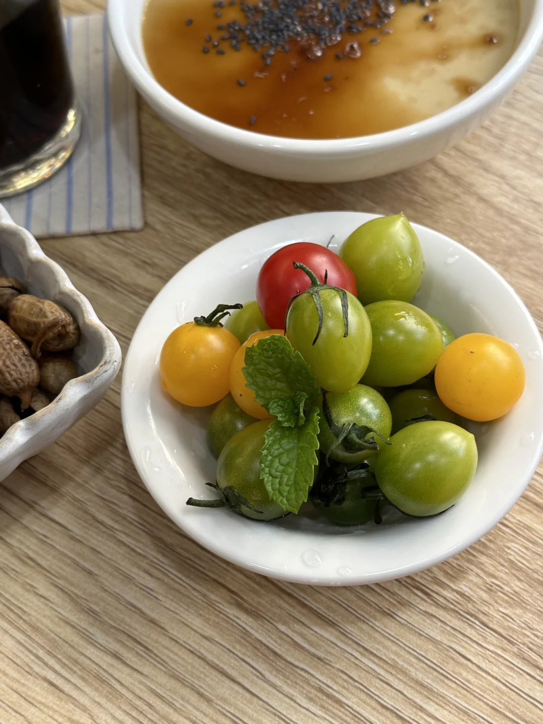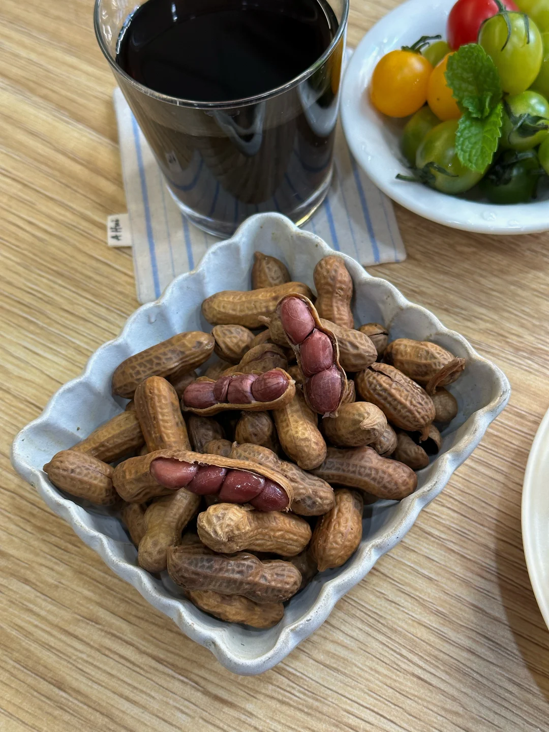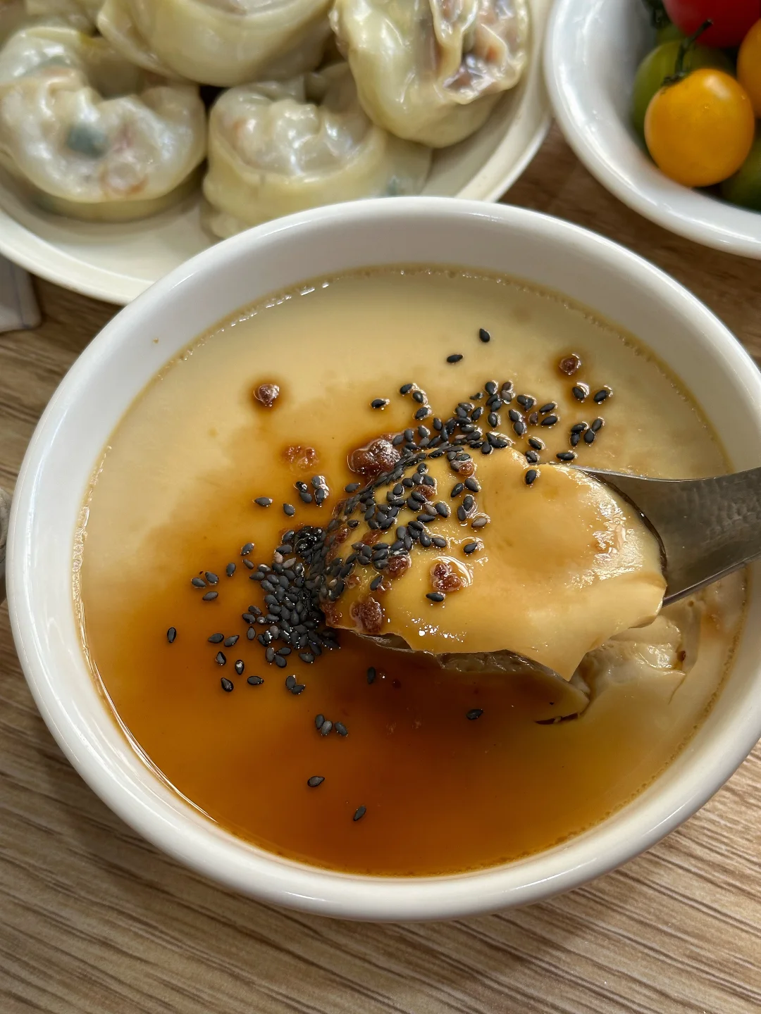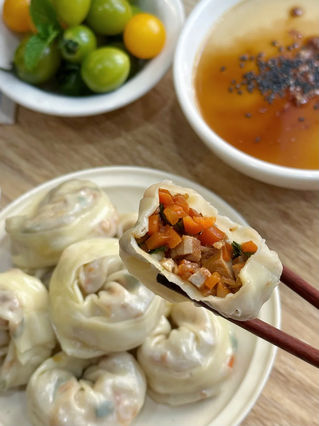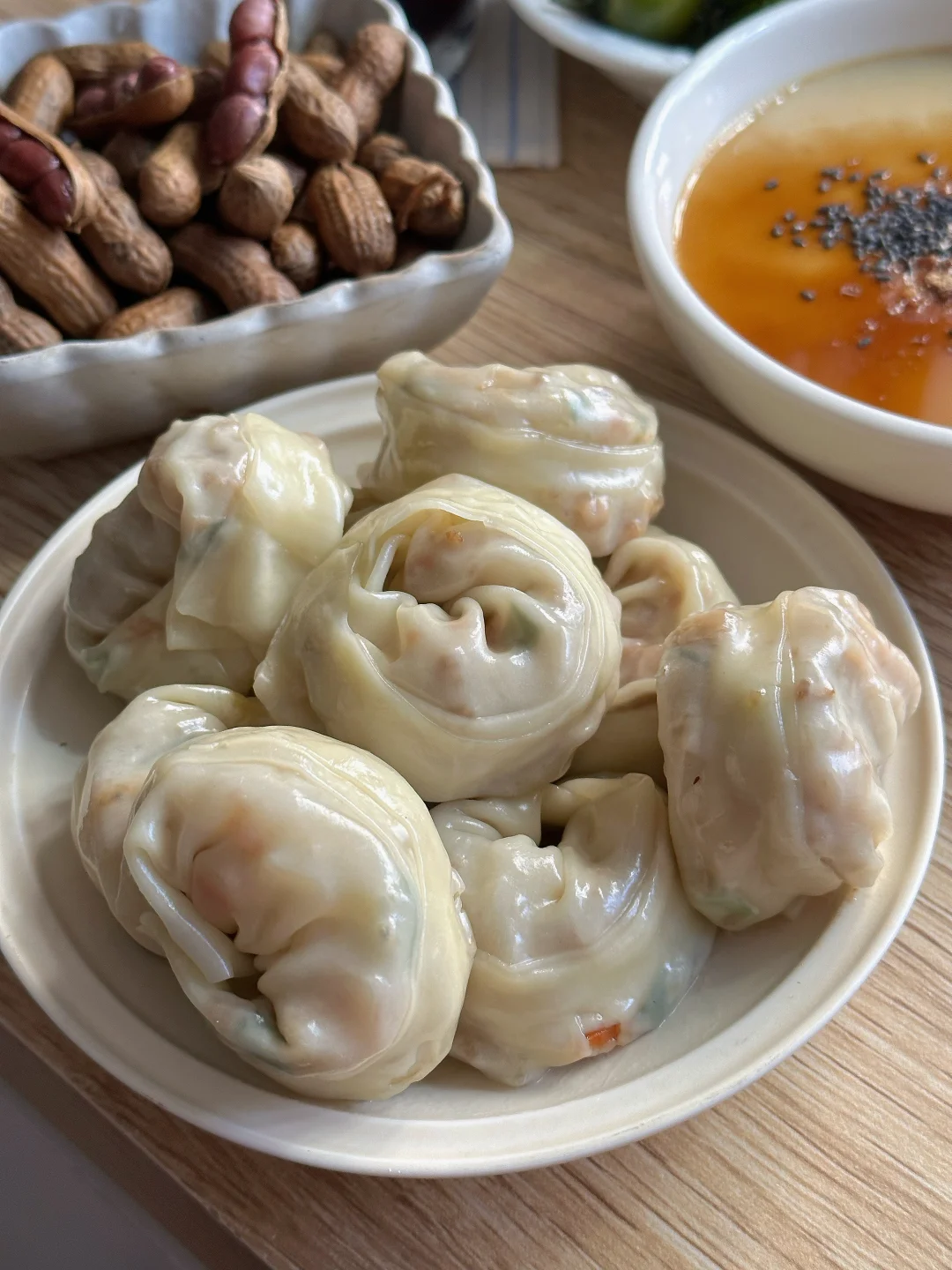 - 🥟扁食(胡萝卜豆干肉末馅) 扁食做过三四次了,今天才惊觉:原来扁食的形状我一直都没包对!从一开始觉得“只要把馅料塞进去就好”,到现在开始琢磨如何整出正确的形状,突然发现它是只“元宝”呀,美食文化太有魅力了,背后真的藏着很多巧思与美感! - 🫕 红糖炖蛋 这款红糖炖蛋是家里常备的甜味滋养。做法很简单。炖蛋主要注意的是比例,按我的口感我会觉得蛋液和水的比例在1:1.7的比较好,不会稠也不会稀,今天这个嫩滑度就很合适! - 🥜 卤花生 🍅 小番茄 ☕️ 咖啡