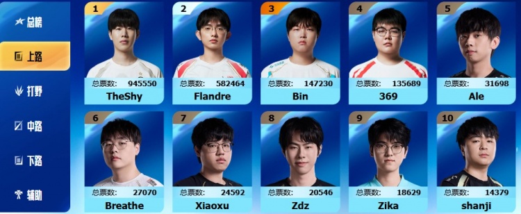 LPL全明星正赛投票上单:票王TheShy断档第一 领先Flandre超30万