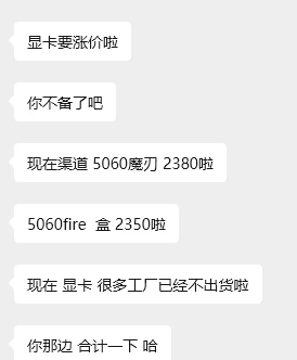 显卡这次要涨价了,主要涨价型号其实是5060,双十一以后显卡掉了200左右,这次,不管是说工厂芯片缺,还是不供货淘宝还是什么的,反正代理商出货价格是要涨起来了。。。为之奈何???反正我们有囤货,等囤的卖完再说涨价后的价格呗。。