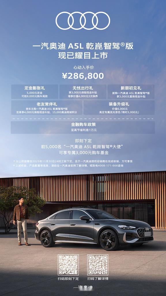 车展报道39:一汽奥迪这次也讲智能,还能讲得信服,因为这次是奥迪A5L乾崑智驾版。有特点的是采用了双激光雷达方案,可实现197.2°广阔的视野范围。搭载了丹麦著名品牌Bang & Olufsen 豪华音响系统,集成 16 枚扬声器,配备车辆噪声补偿(VNC)功能。