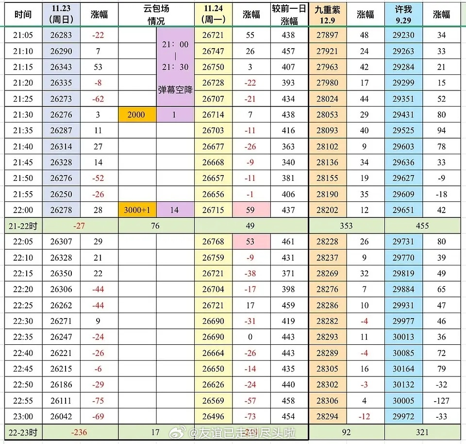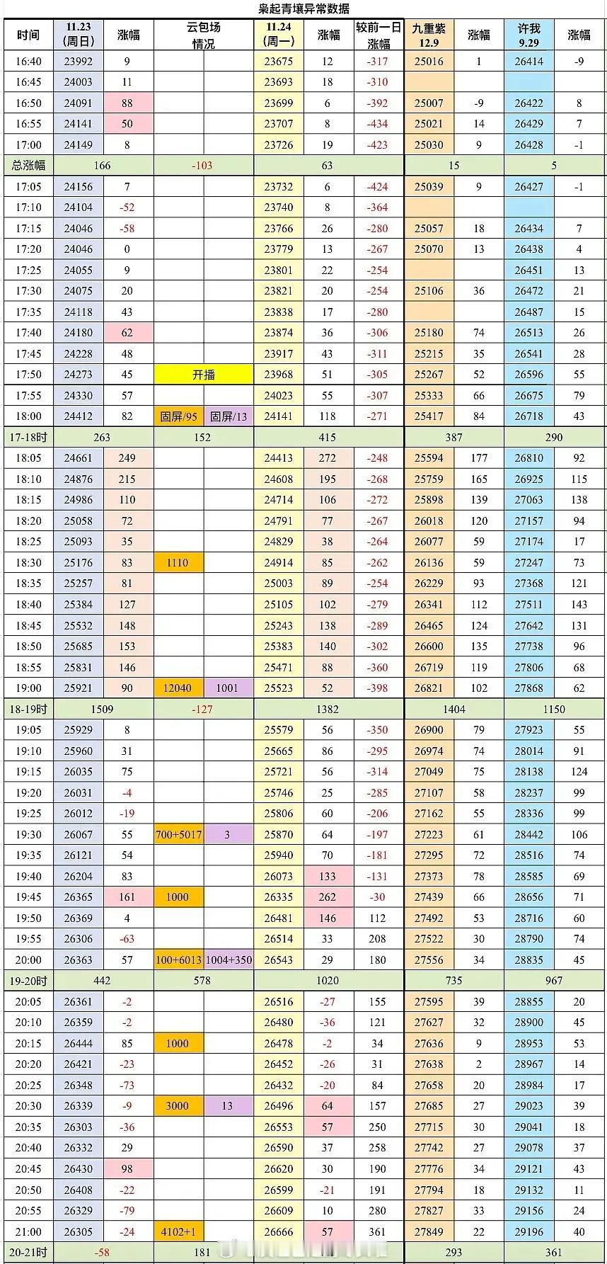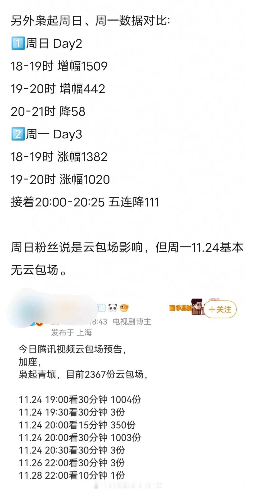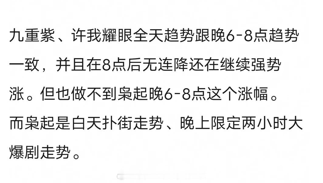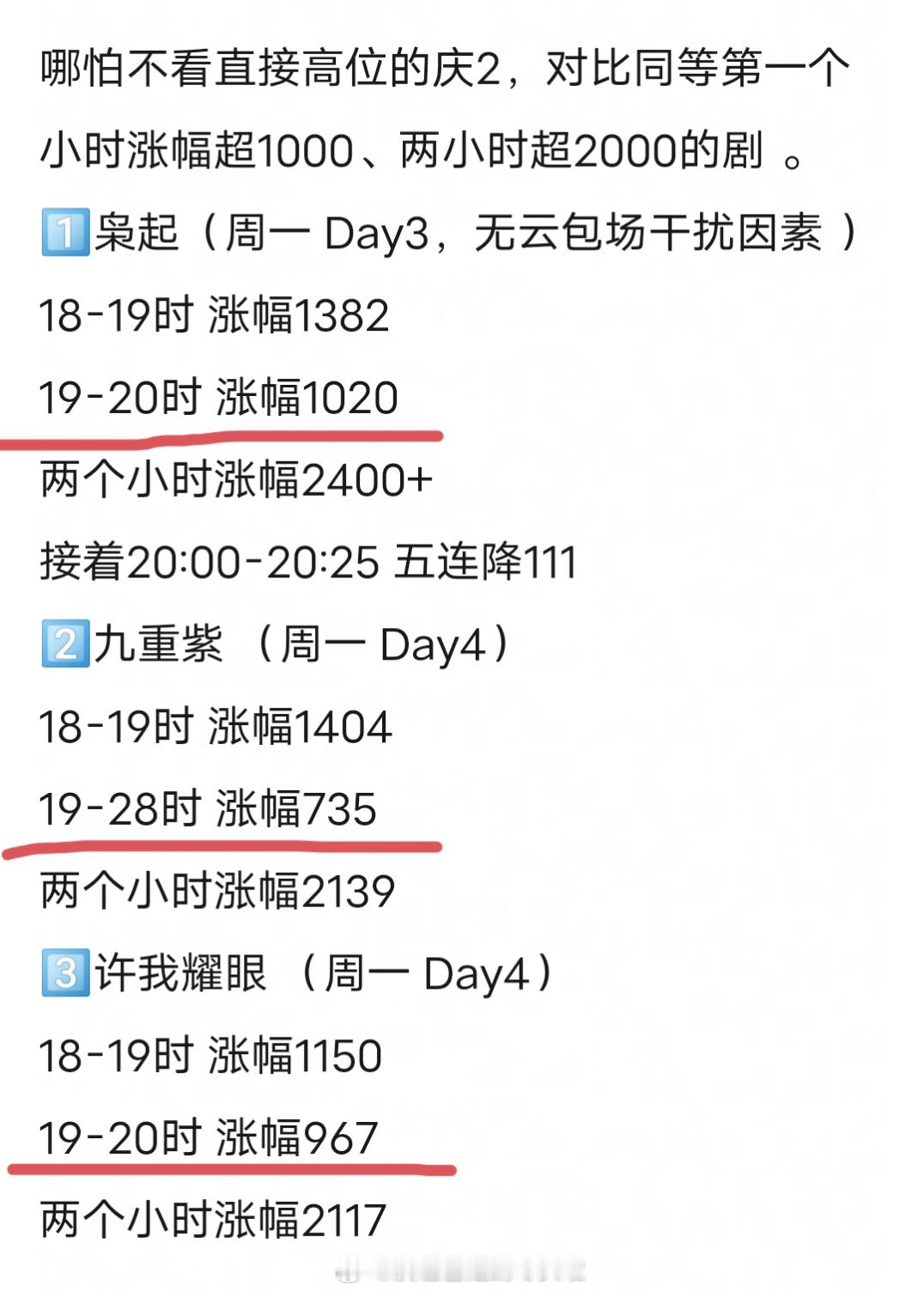 庆余年2晚上7点半更新,第二个小时的热度涨幅,第三天是799。对比同等第一个小时涨幅超1000、两个小时超2000的剧,许我耀眼和九重紫第四天同样也是周一,第二小时热度涨幅分别是967和735,全天趋势和晚上6-8点趋势一致。枭起青壤第三天第二小时热度涨幅1020,限定两小时涨幅完全大爆剧走势。。。