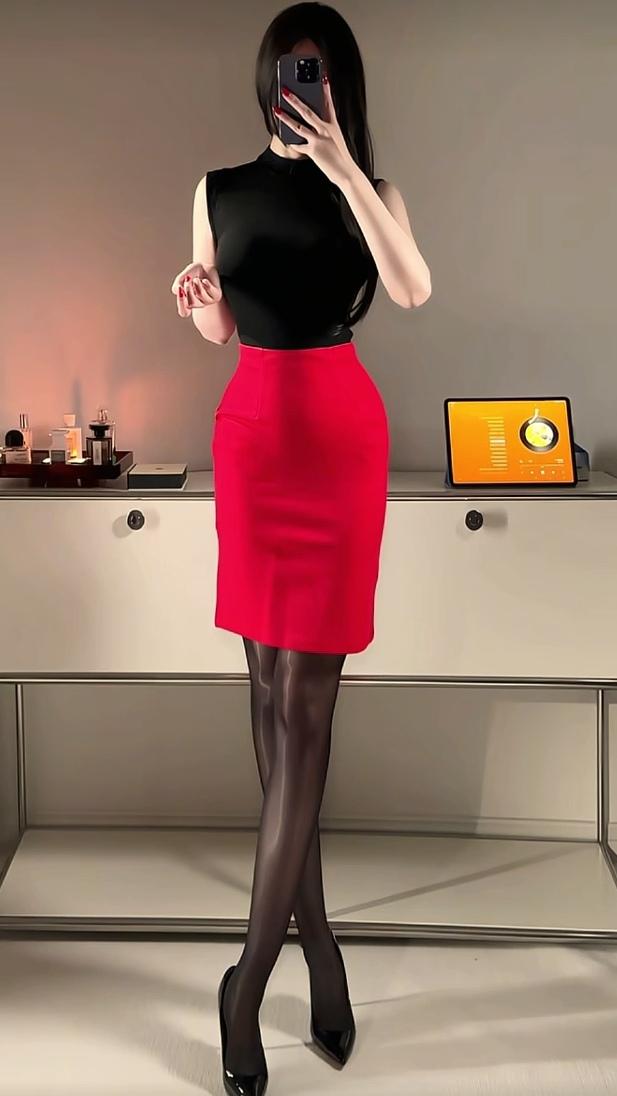 黑红撞色包臀裙穿搭:演绎“职场精致感”的致命诱惑 黑色无袖高领上衣,自带一种利落气场。其修身版型贴合规整的肩线,将“干练感”牢牢把握;下身搭配正红色包臀裙,明艳的色彩瞬间驱散了黑色的沉闷。修身裙型恰到好处地勾勒出腰臀曲线,让“专业感”中增添了一抹恰到好处的女性魅力。 搭配一双哑光黑丝,细腻质感使腿部线条更为柔和,中和了红黑撞色的锐利,营造出一丝轻熟氛围;同色系尖头高跟鞋从脚踝延伸至小腿,悄然拉长腿部比例,让整套穿搭既符合职场着装的得体要求,又暗藏着约会时吸睛的小心思。 没有多余的装饰,凭借黑红撞色的经典对比以及单品的简洁利落,将“日常通勤也能成为焦点”的感觉展现得淋漓尽致。背景中的暖光与简约收纳柜,反倒更凸显出穿搭的精致魅力。 如何穿得优雅有气质 包臀裙