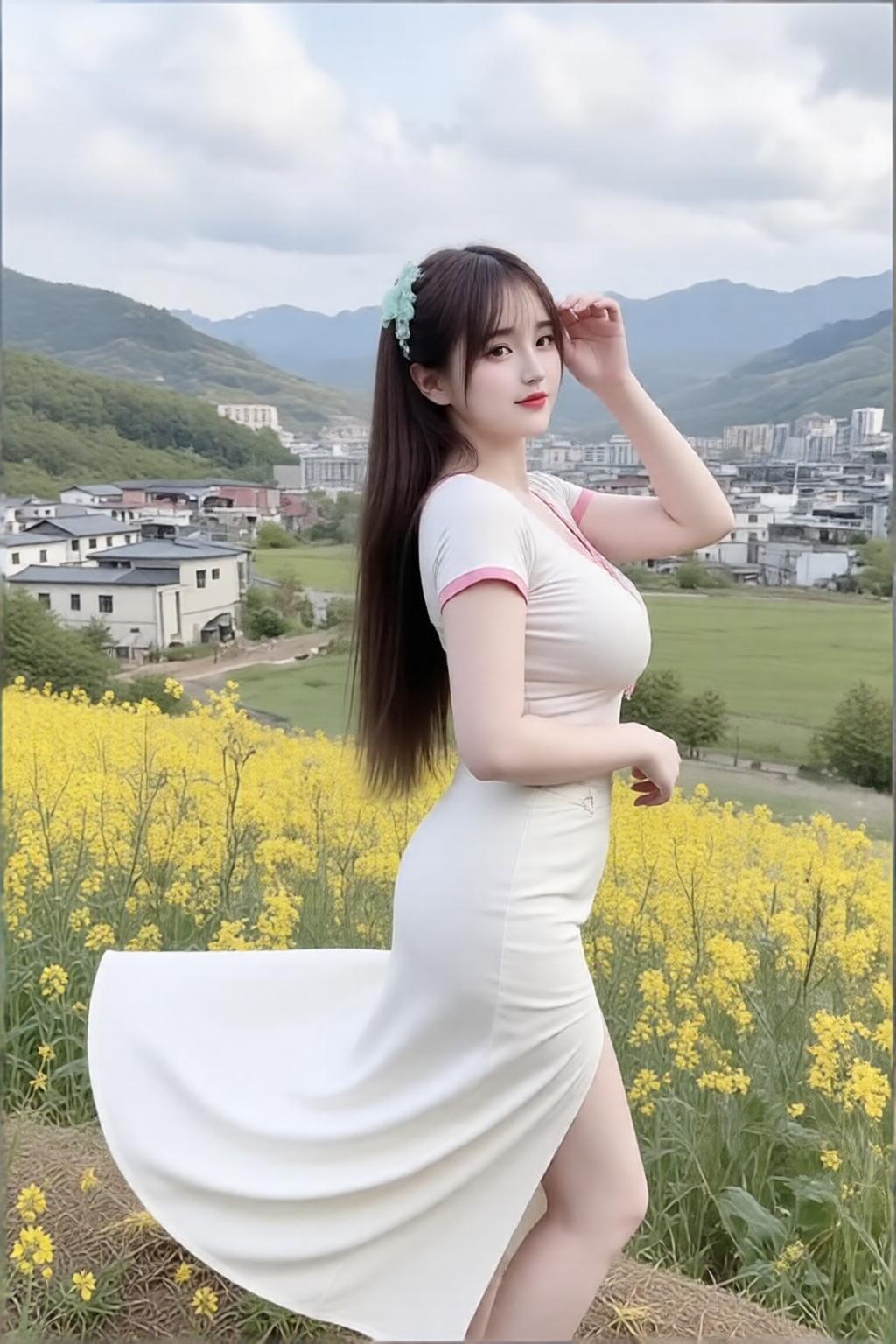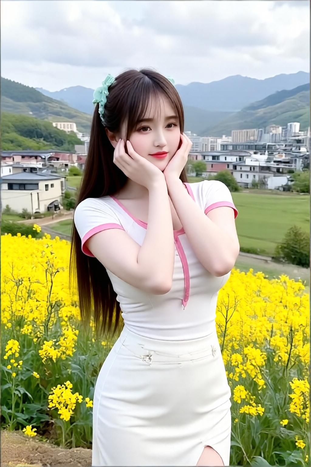 甜美少女风,粉色边白色连衣裙,花海中的浪漫时光