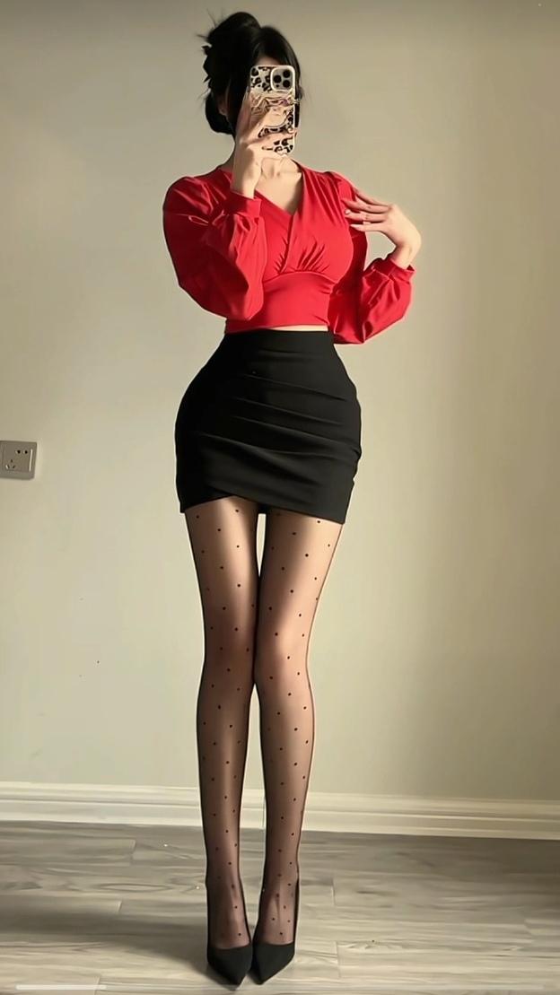 红黑配的复古张力,把“明艳感”穿在身上 正红色V领褶皱上衣自带“第一眼焦点”属性,收腰设计刚好卡在腰线最细处,微喇长袖添了几分复古柔美感,和黑色包臀短裙形成经典红黑撞色,利落的裙型把身材曲线勾勒得恰到好处。 波点黑丝是整套穿搭的“小心机”,细碎的波点中和了红黑的锐利感,添了点复古甜酷的氛围,搭配同色系尖头高跟鞋,从脚踝延伸到小腿的线条感,让比例看起来更修长。 没有多余装饰,靠红黑撞色的强烈对比和单品的细节呼应,把“日常也能穿出约会氛围感”的感觉拉满,简洁的背景反而更能突出穿搭的明艳张力晒图笔记大赛时尚穿搭