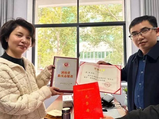 临澧县委社工部马春生(右)代刘玲领取“湖南省最美志愿者”荣誉