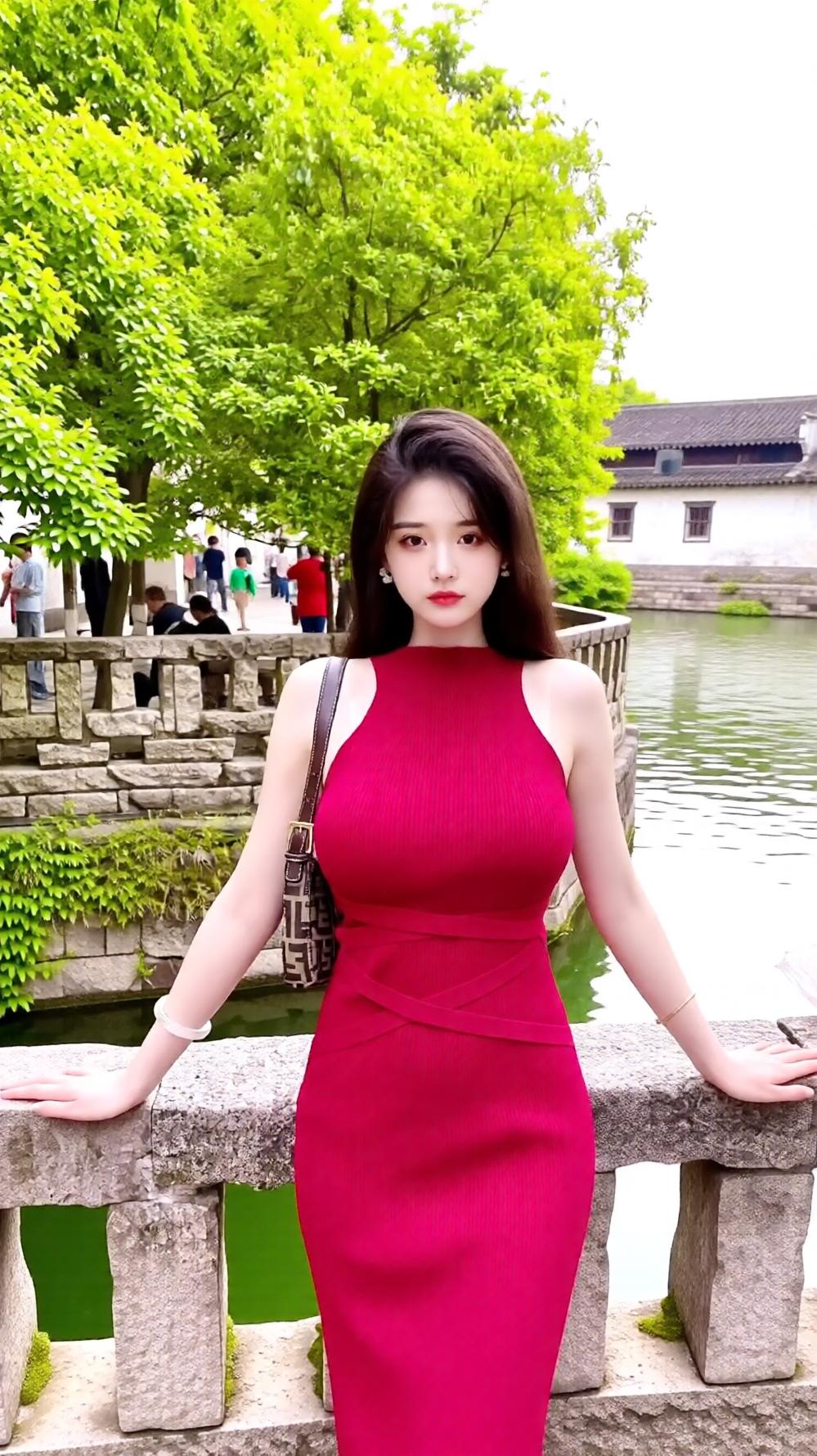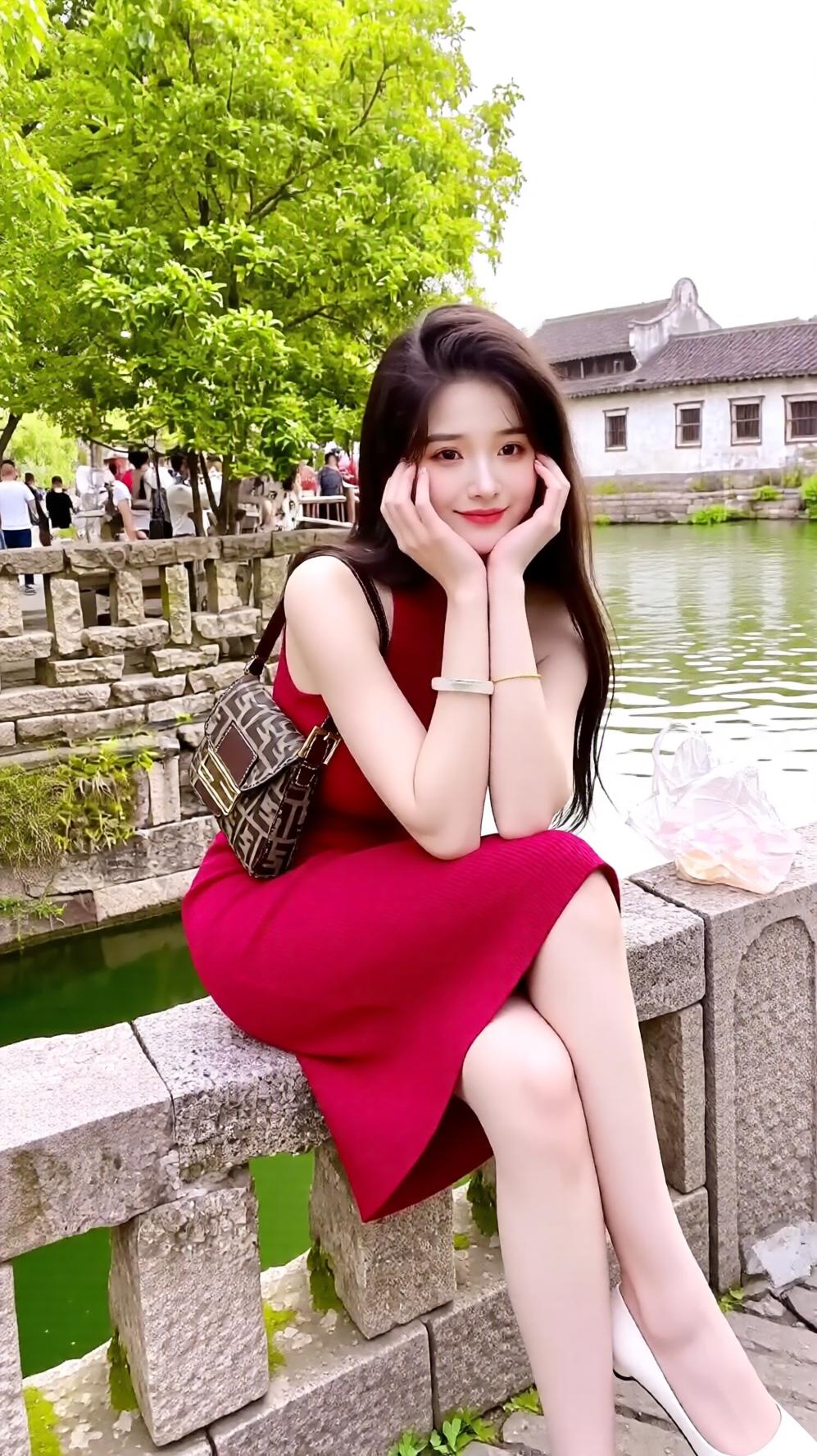 在古桥边,穿红裙的少女静坐,仿佛时光静止。